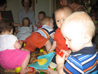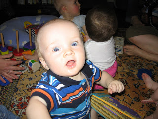 Quinn and I had a busy day today. We joined the \”Raising in the Rain\” playgroup at one of the mom\’s house and there were a good 15 or so mom\’s there with their babies. The mom, Sarah, made us lunch and then let us wreck her house 😉 It was a lot of fun.