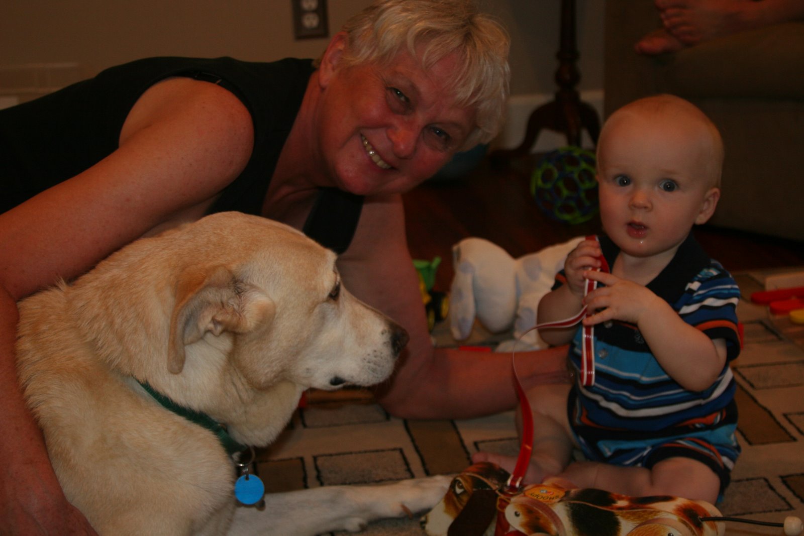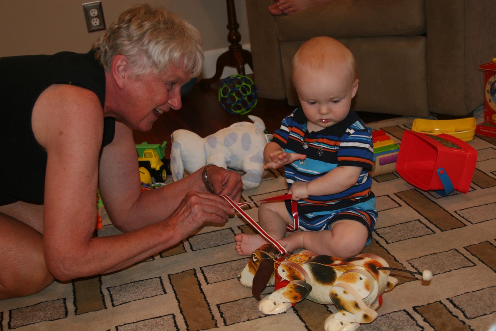 After the playgroup we zoomed to the airport to pick-up Barbara. Barbara came with a box full of toys that Don used to play with and one was this very cute Snoopy dog that you can pull. Quinn was pretty fascinated.