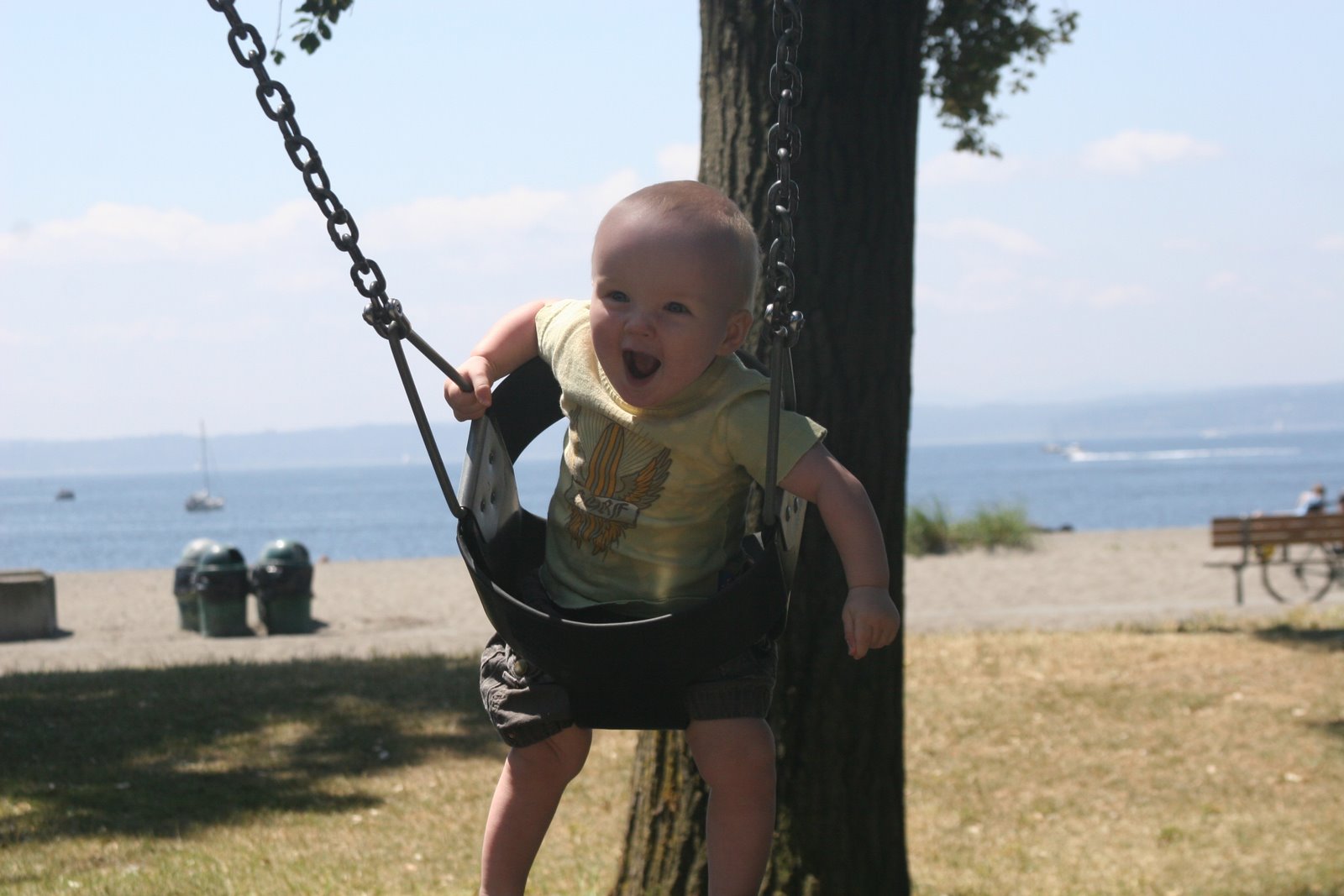 Quinn enjoying the swing — you can see the ocean in the background