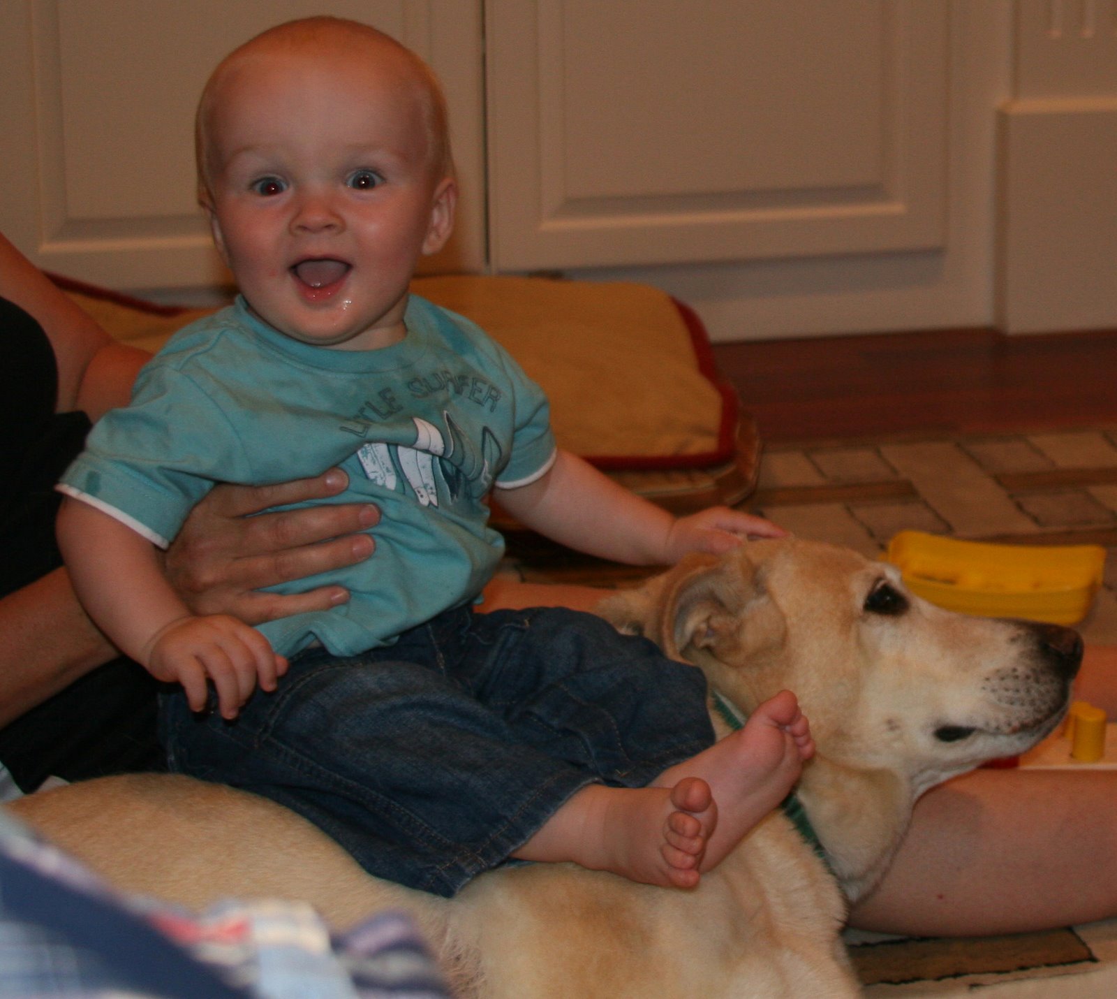 I think that Darwin may be becoming fond of Quinn ;>) He\’ll actually lie near Quinn and won\’t get up as soon as I sent Q down. Here Darwin is just chillin\’ while Quinn takes a ride.