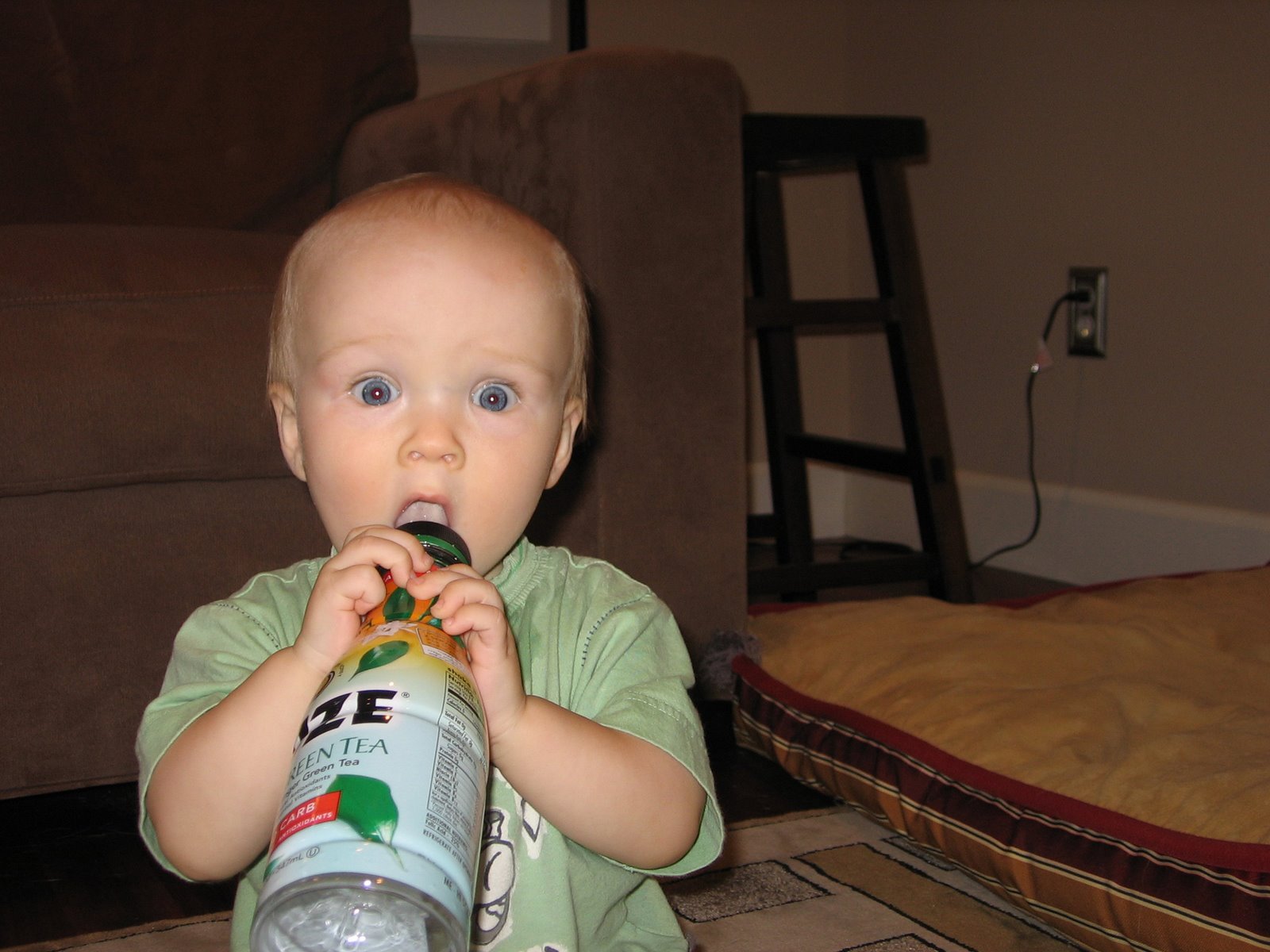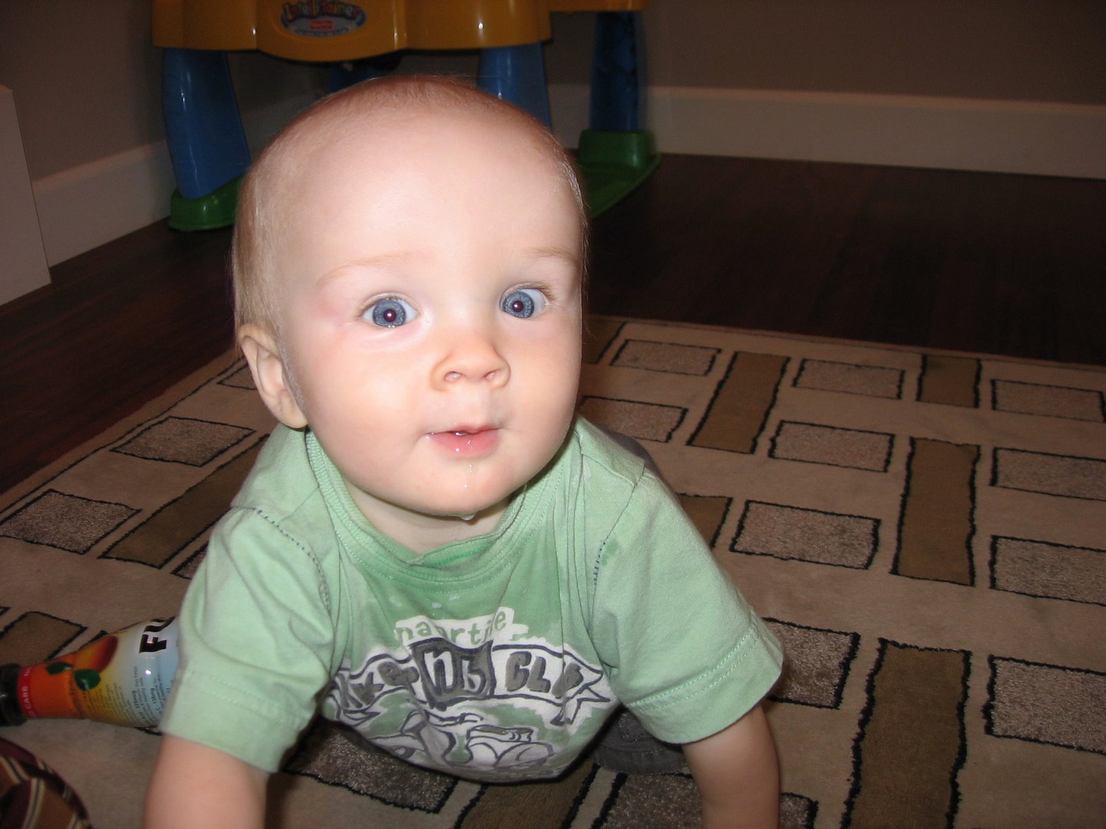 Don got home from his business trip and we were just hanging out with Q and D-Dog before dinner. One of Quinn\’s favorite new toys is a empty plastic Fuze bottle with pennies in it — he can really shake it!! Here\’s a video of his newly mastered crawling skills and his favorite toy.