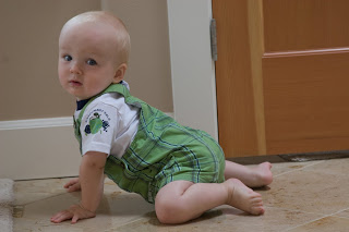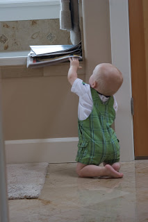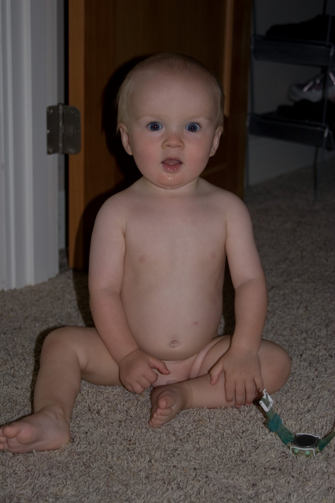 And here he is in a little outfit that was a gift from Uncle Curt and Aunt Judy. I got a picture because I think it\’s his last time fitting in to it. As far as trouble, now he\’s in undiscovered territory — the bathroom.