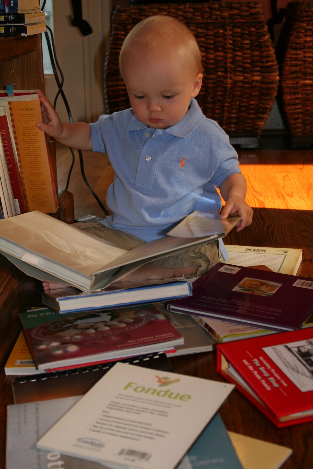 On Friday we headed over to Joanne and Jim\’s. Joanne\’s cookbooks were easily accessible and Quinn loved to pull them off the shelves.