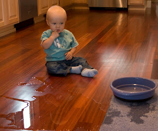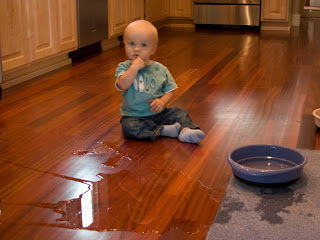 Now that Quinn is pretty mobile, he\’s getting in to lots of stuff. Tonight while I was cooking dinner he was checking out the pantry drawers and also the mixing bowls. Yesterday he discovered Darwin\’s water dish before I could get to him. He looks pretty perplexed as to how this happened.