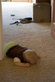 Here you can see the carnage he left in his wake. We still have one upacked box in the bedroom that contains stuff that was in our dresser (which is now in the garage). Little did I know what a great source of entertainment it would be for Q. He loves to reach in to the box and see what he can find. As you can see, he found quite a few things.