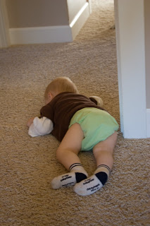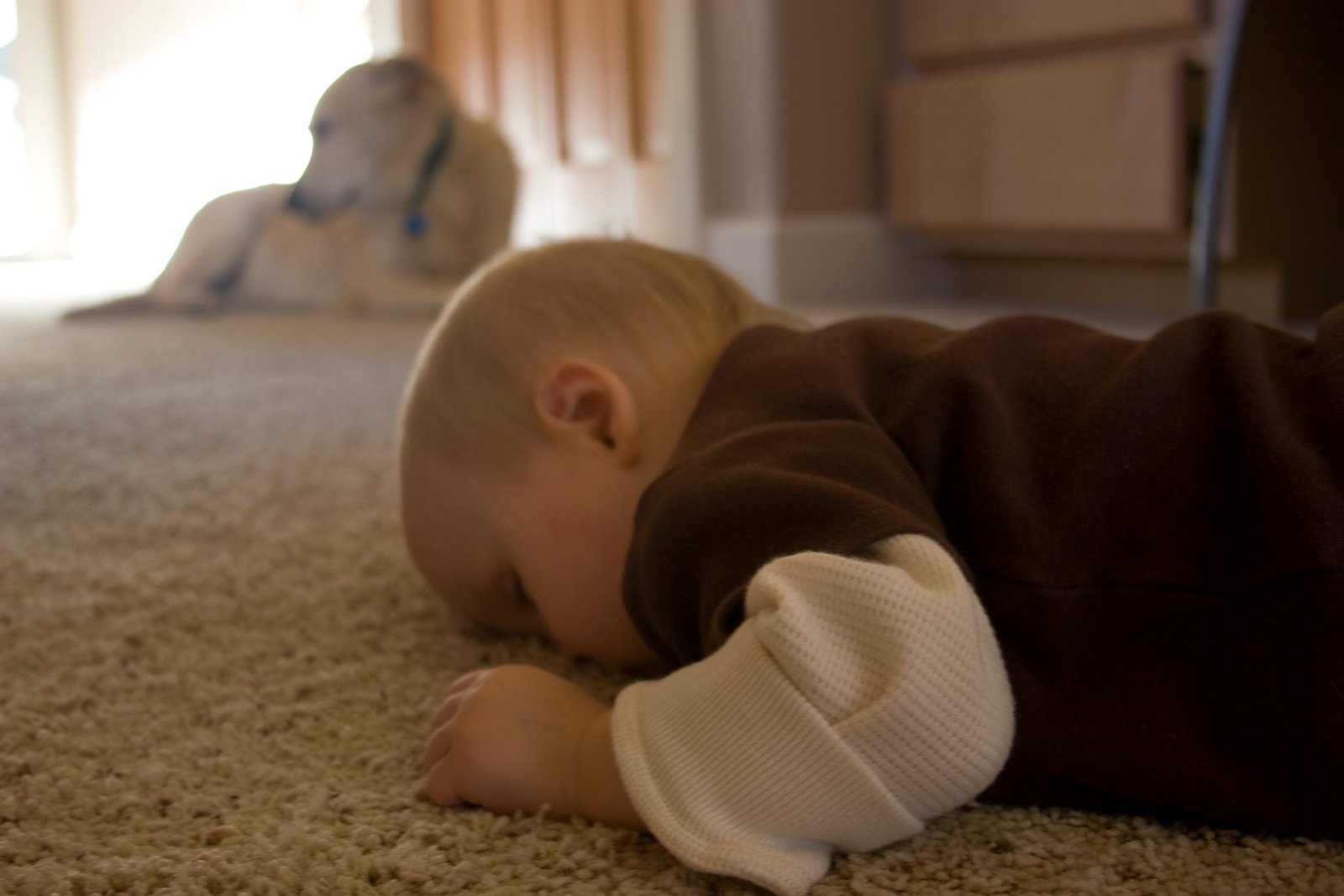 He was crawling accross the carpet and fell dead asleep in the doorway. Darwin\’s hanging out in the back ground because he doesn\’t like to cross over when Quinn is in the way. I think Darwin recognizes that he\’s at the bottom of the pack (good boy:).