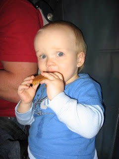 Having a chocolate chip cookie on the plane. He was digging it!!