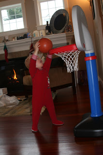 Shooting some hoops with his new basketball hoop from Grampa and Gramma.