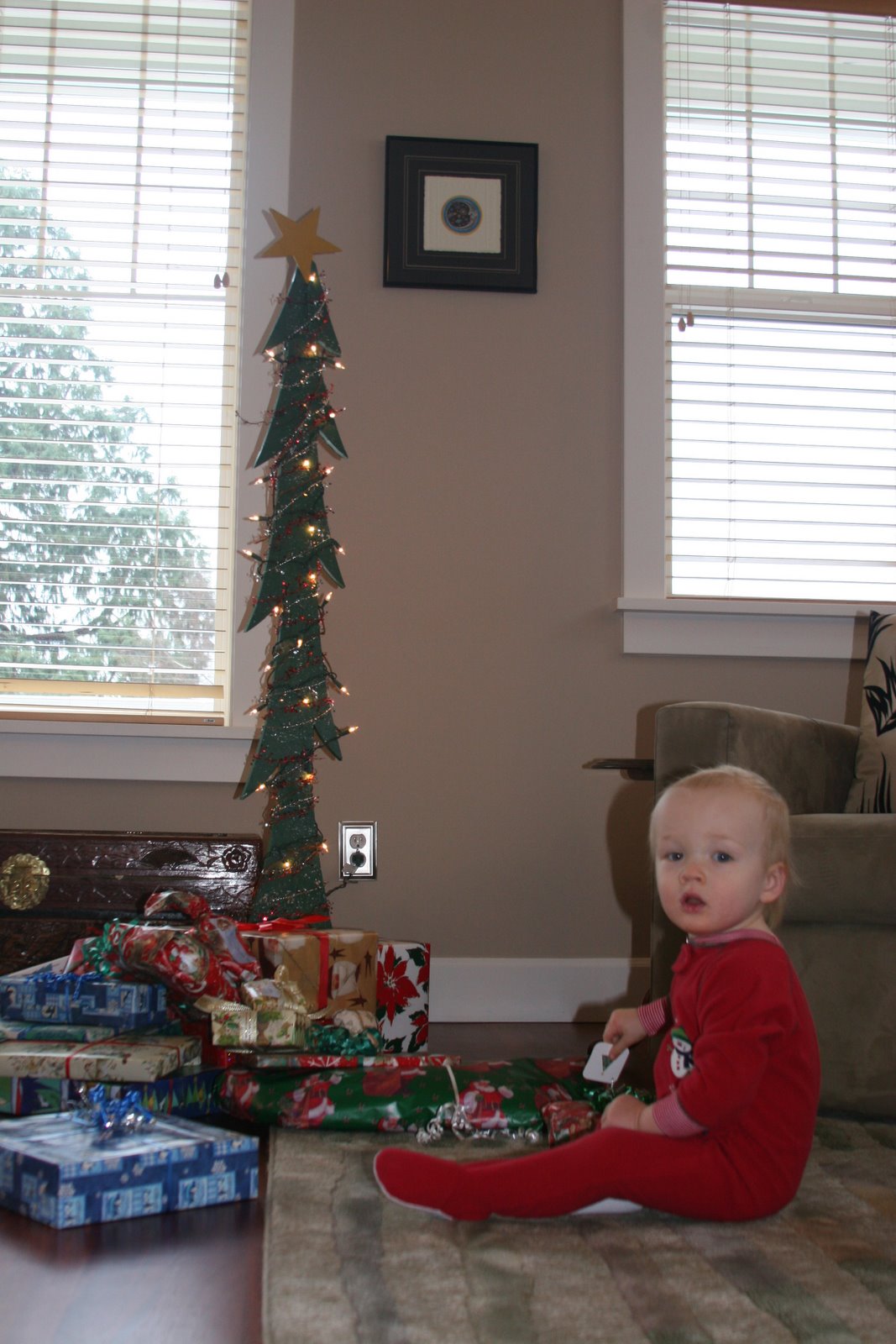 Here\’s Quinn standing in front of our make-shift Christmas tree which I got at a craft fair in Frederick MD about 10 years ago. I\’ve strung it with lights and garland to spruce it up.