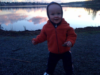 Quinn and I took a walk by the lake yesterday afternoon. I put him on my back to get down to the lake and then he walks around once we get there. He enjoyed picking up sticks, rocks, pine cones, etc. He was also having a good time checking out the kids on razor scooter, dogs walking by, and the ducks in the lake. Quinn was gettting lots of admiring looks as he toddled along 😉