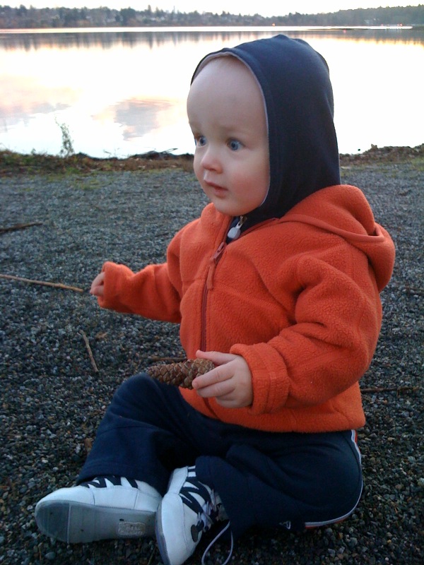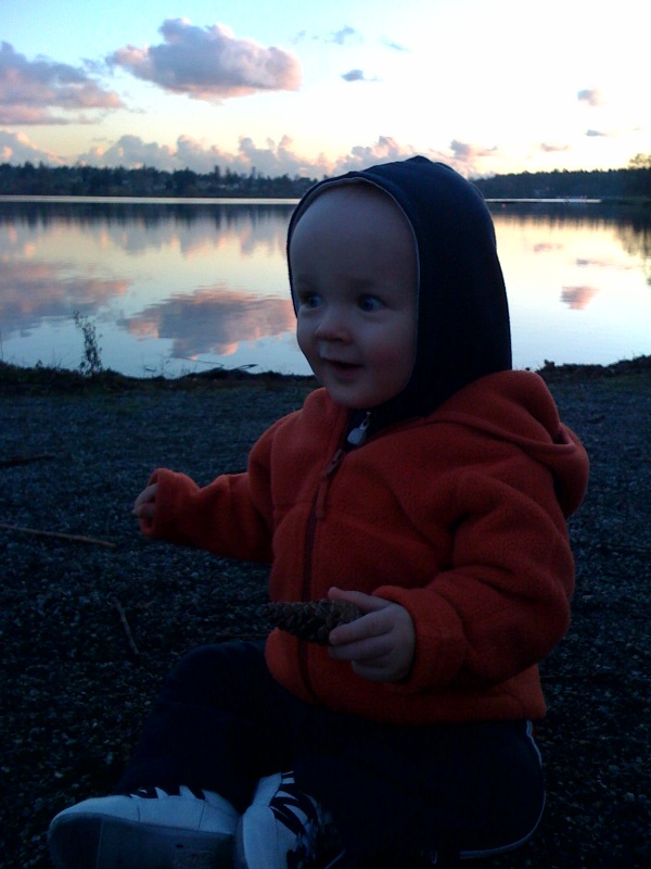 Quinn and I took a walk by the lake yesterday afternoon. I put him on my back to get down to the lake and then he walks around once we get there. He enjoyed picking up sticks, rocks, pine cones, etc. He was also having a good time checking out the kids on razor scooter, dogs walking by, and the ducks in the lake. Quinn was gettting lots of admiring looks as he toddled along 😉