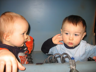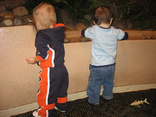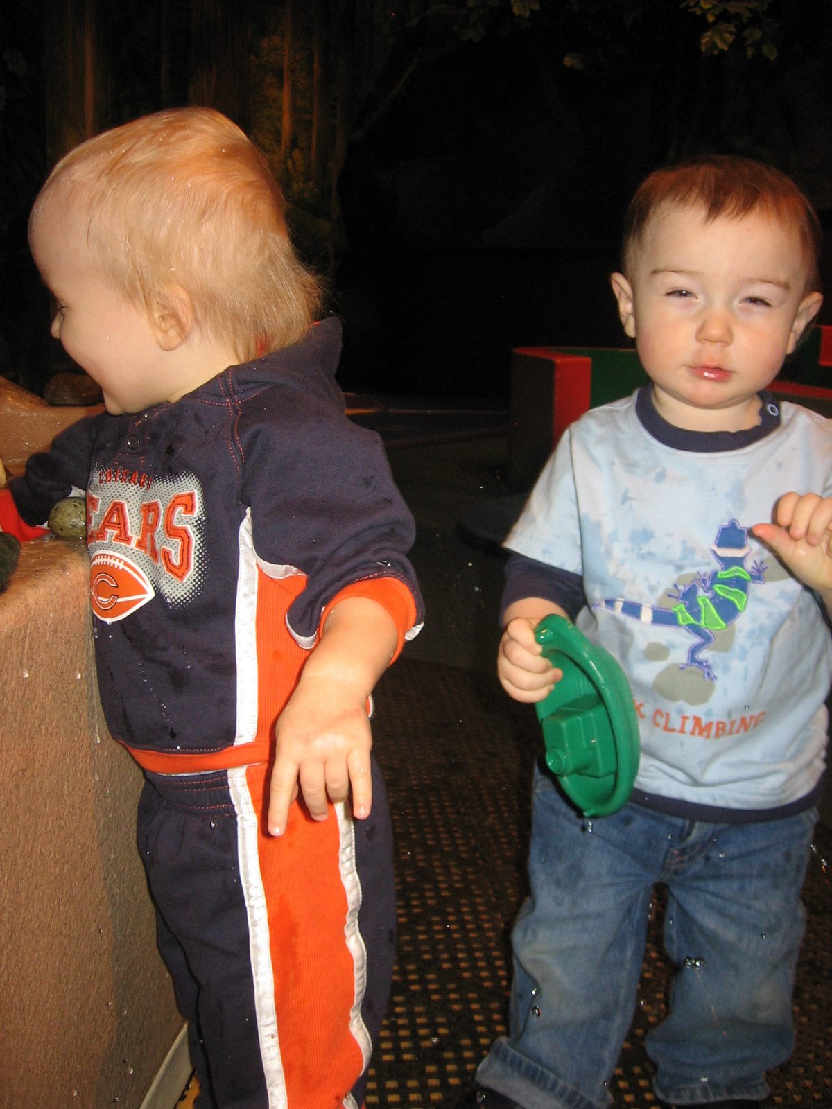 We started off in the toddler room where there was a water table which kept the boys occupied for quite some time. They were having so much fun — Quinn was busy splashing everyone and Kieran was taking boat loads of water and pouring it everwhere! Fun, fun!