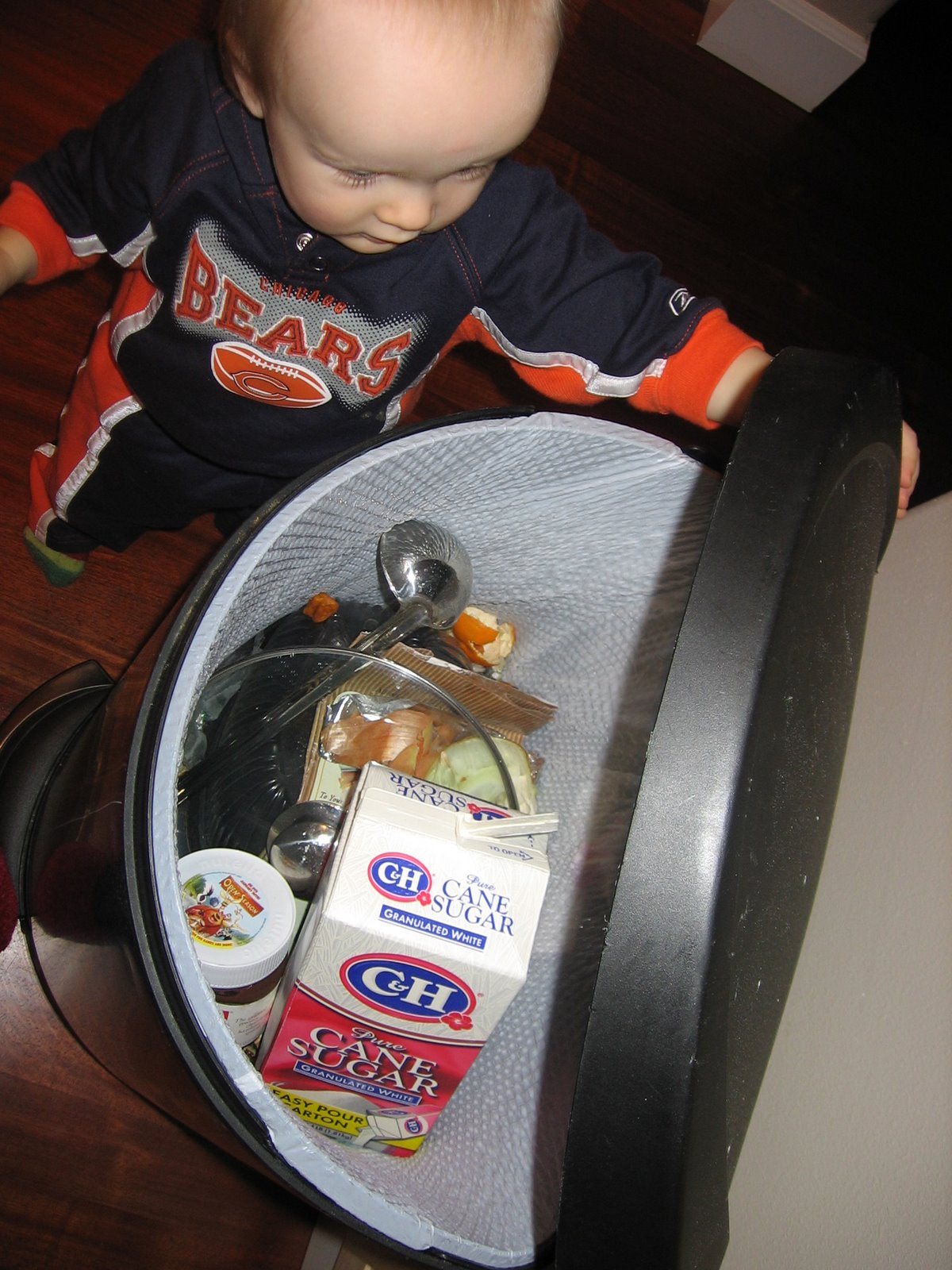 While I was cleaning up the kitchen, Quinn was rustling through the drawers and looking for hidden treasures. He was spending a bit of time over near the trash can and I glanced over and he was trying to get a large lid to a pot in the trash can. Well, I guess he had been at it a while because I found another lid, a ladle, a box of sugar, and a jar of Nutella (ahhhh!) in the trash. It is pretty amazing where I find stuff these days.