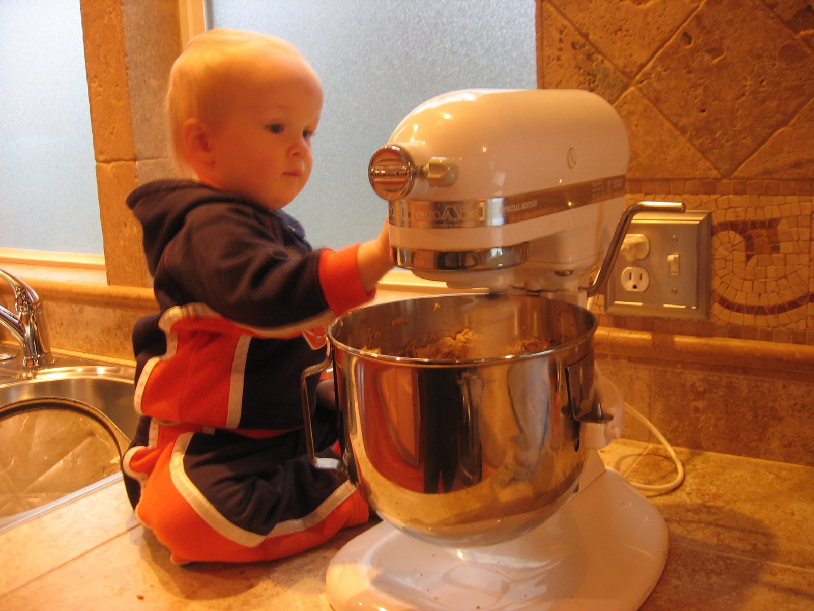 Quinn and I made some Oatmeal cookies today for our bedtime snack. I measured out all the ingredients and Quinn helped turn the mixer on and off and on and off and on and off…. The cookies turned out great and I think Quinn enjoyed his first cooking experience with his chef mom.