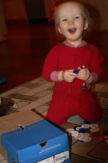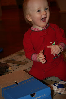 One of Quinn\’s favorite toys is a shoe box with a slot cut on top filled with poker chips. The chips make great noise when he puts his hand in there and mixes them up. He loves to put the chips through the slot. Here are bunch of pics of Q having some fun today