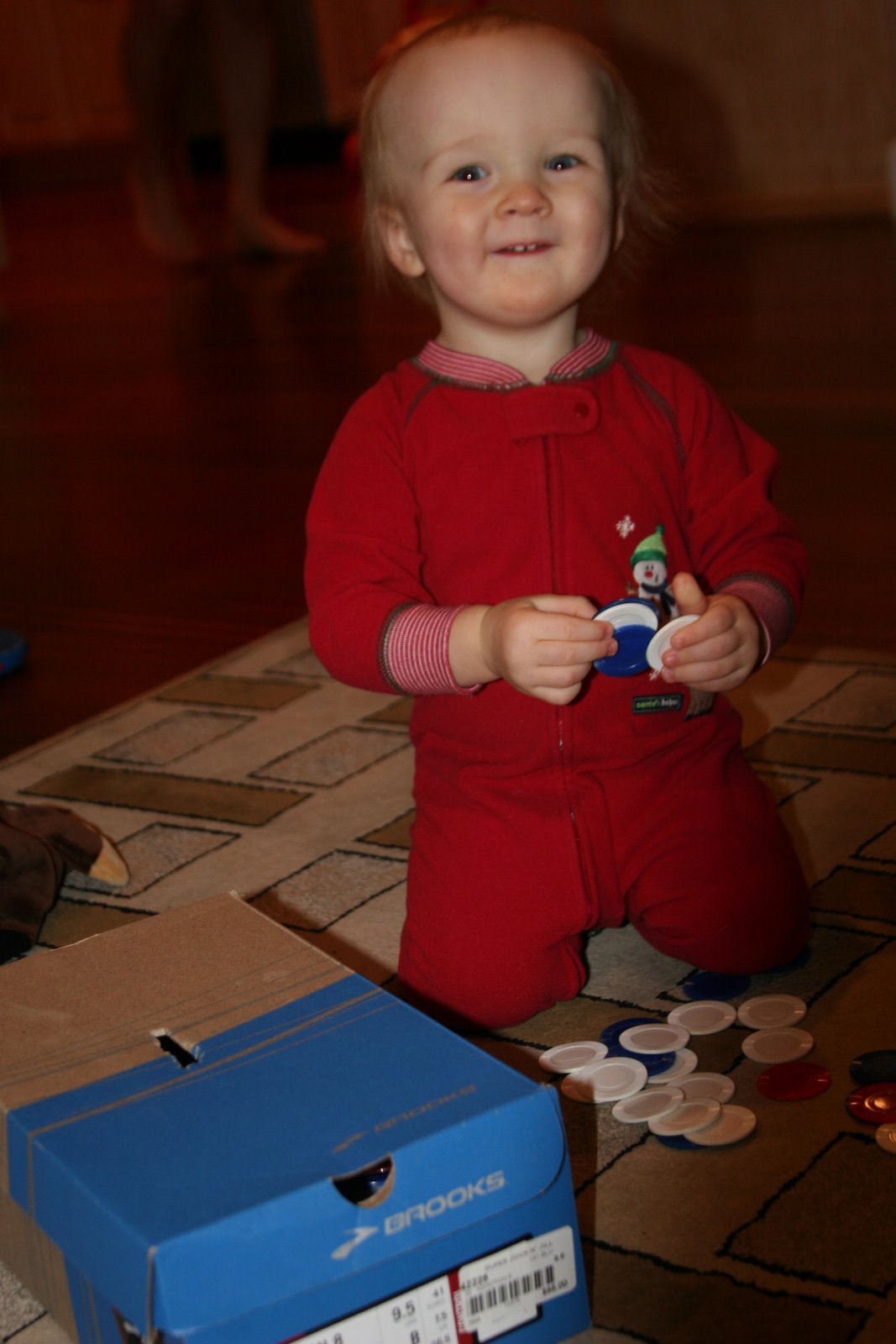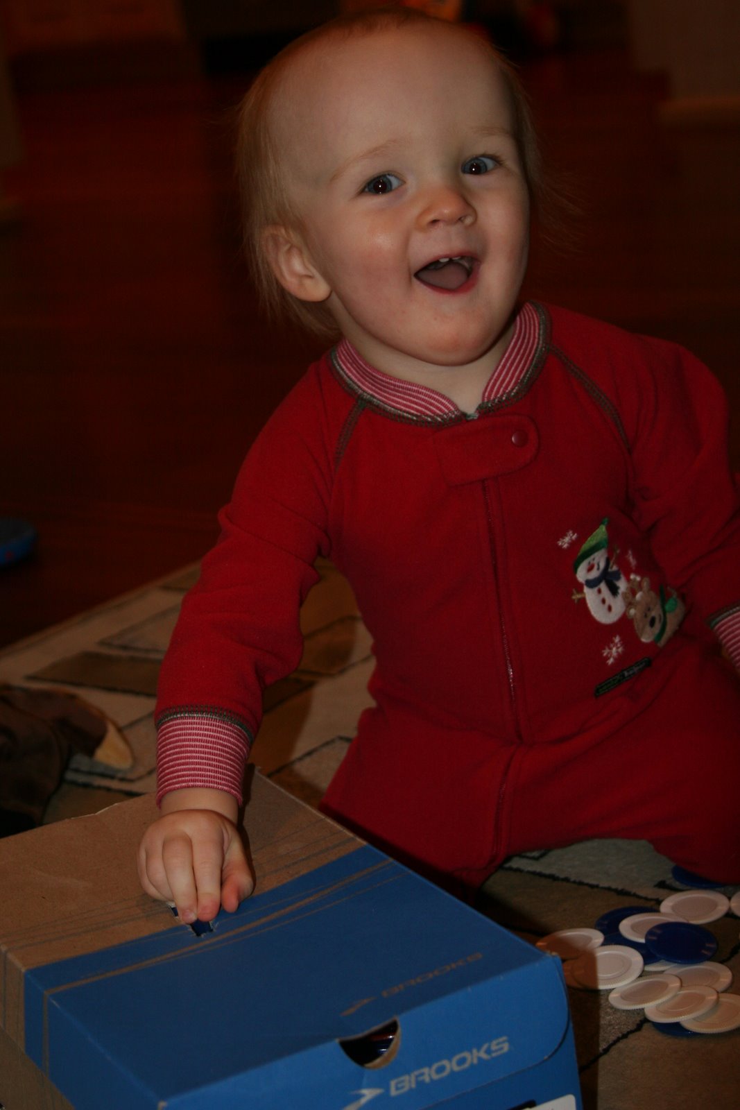 One of Quinn\’s favorite toys is a shoe box with a slot cut on top filled with poker chips. The chips make great noise when he puts his hand in there and mixes them up. He loves to put the chips through the slot. Here are bunch of pics of Q having some fun today