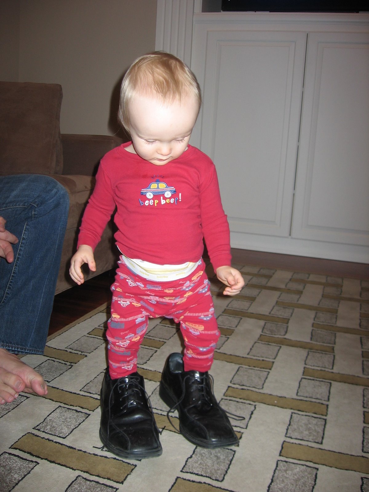 Every kid needs to try on his papa\’s shoes. Here\’s Quinn giving it a go. Nothing like red pajamas and black dress shoes.