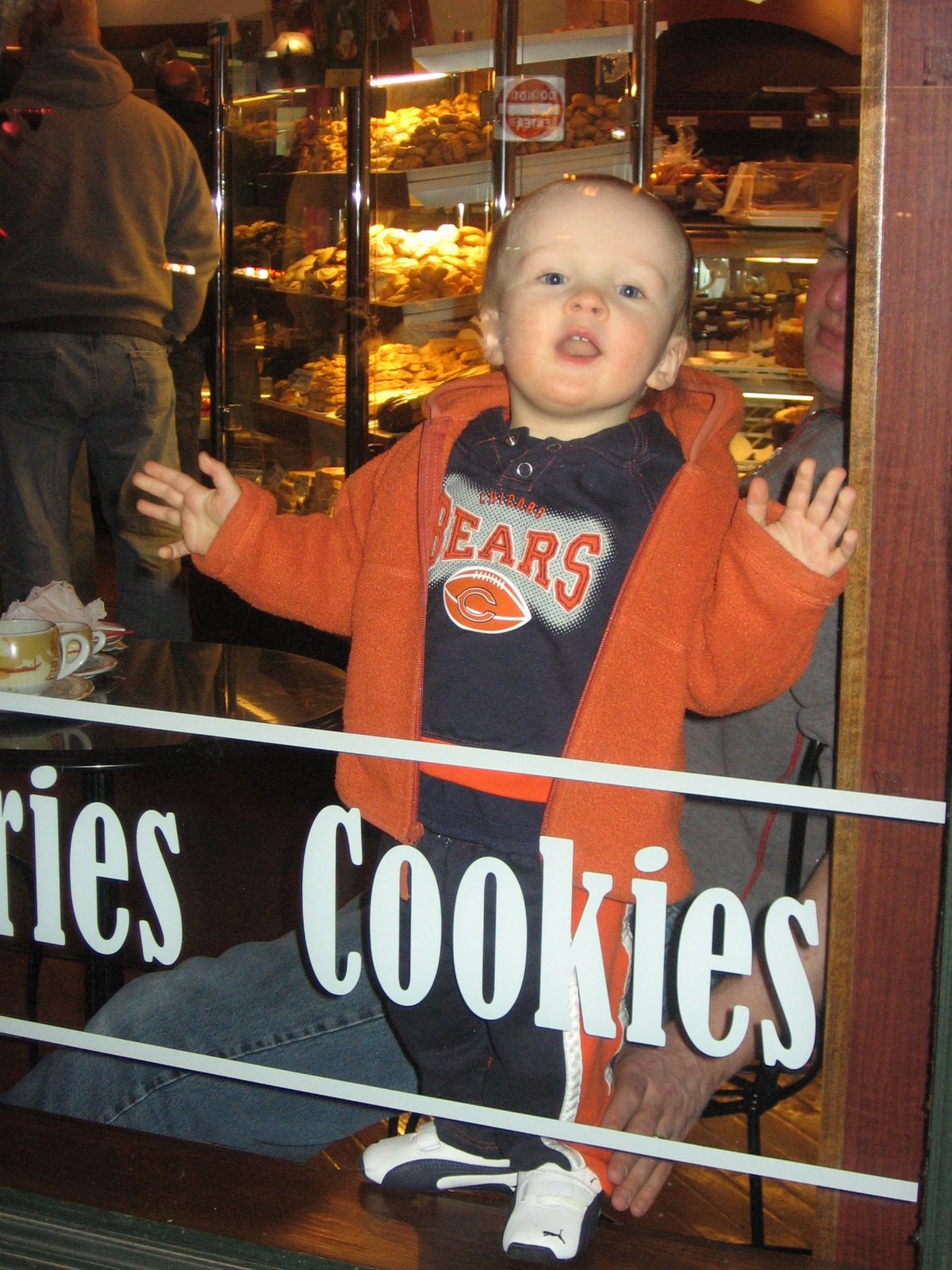 Here are some pics of the little guy at the pastry shop. He just got a new pair of Puma\’s so I thought I would include a shot of his hot shoes. In the last shot I was outside looking in.