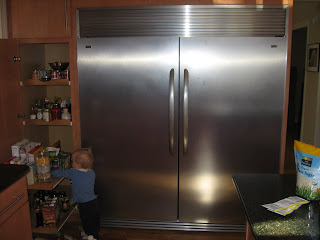 The previous owners of the house installed this humungous fridge/freezer. The fridge is a pretty normal size but the freezer is much larger than your usual freezer. We have it about 1/10 full, maybe.