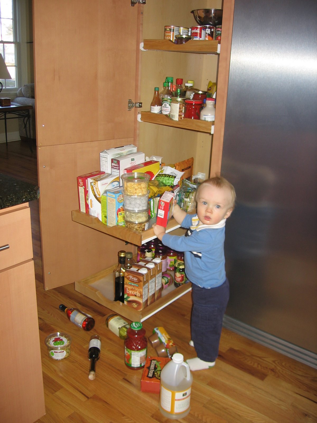 Oh how TMQ loves to get in to the kitchen cabinets. The pantry is one of his favorites and the pull out shelves make it quite convenient for him to get in to just about everything.