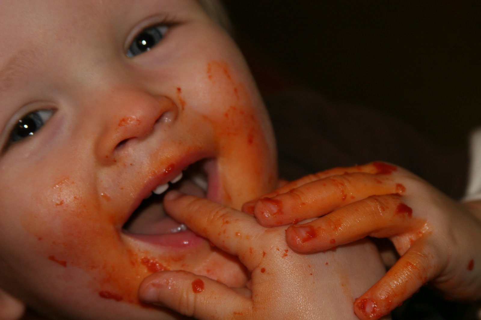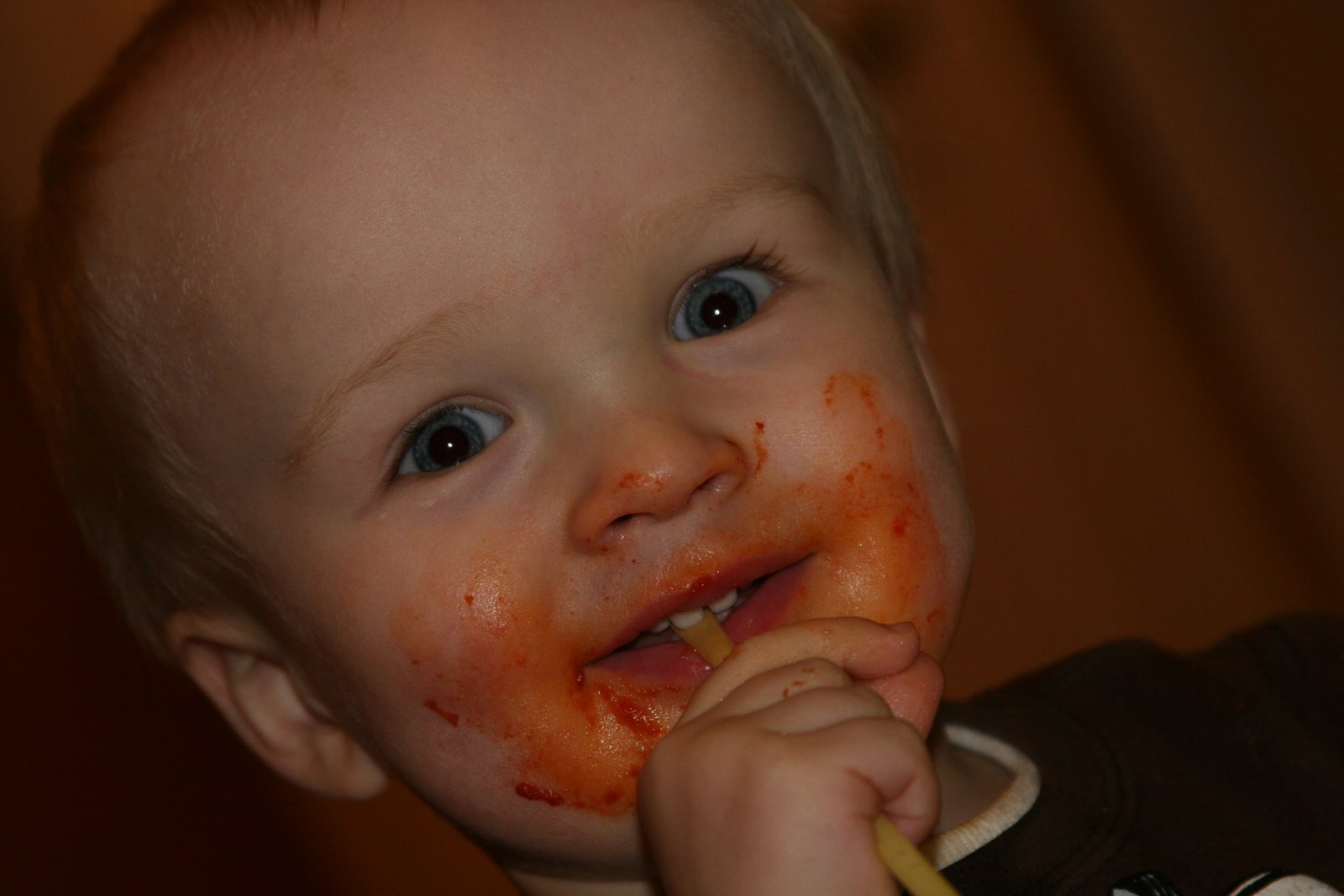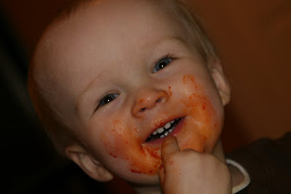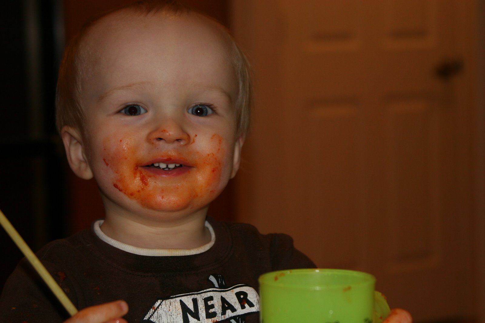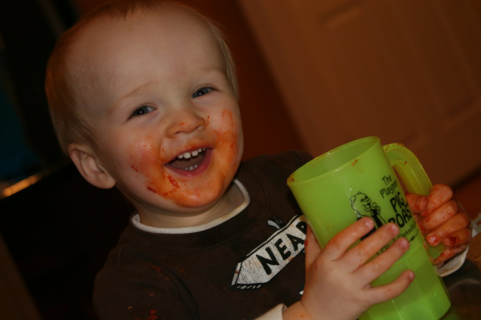 …one must eat tomato pie and ziti with gravy! We\’ve found a great little italian restaurant up the street that makes a great tomato pie (cheese pizza) and eggplant parmesan with ziti. Quinn loves his carbs and any type of pasta. He can really shovel in the ziti. Here are some shots of him after dinner. He also loves to drink out of a cup so we found this plastic mug that is the perfect size. Some of you may recognize this mug, although beer would have been the appropriate filler.