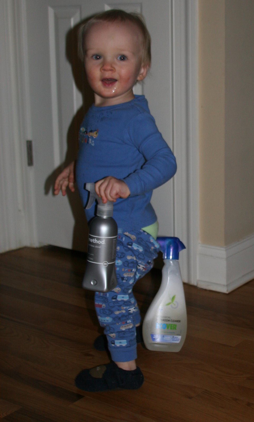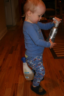Quinn was his usual mischievous self after dinner tonight and was getting in to all the kitchen cabinets. He especially loves the cabinet under the sink with all the spray bottles. Good thing we\’re a non-toxic cleaning kind of home. So Quinn comes around the corner and this is what I see. ROTFLMAO!!!! I asked Don if he had hung the bottle off Q\’s butt but he had not. Quinn had managed this look all by himself! He thought it was pretty funny too and was running circles around the house!