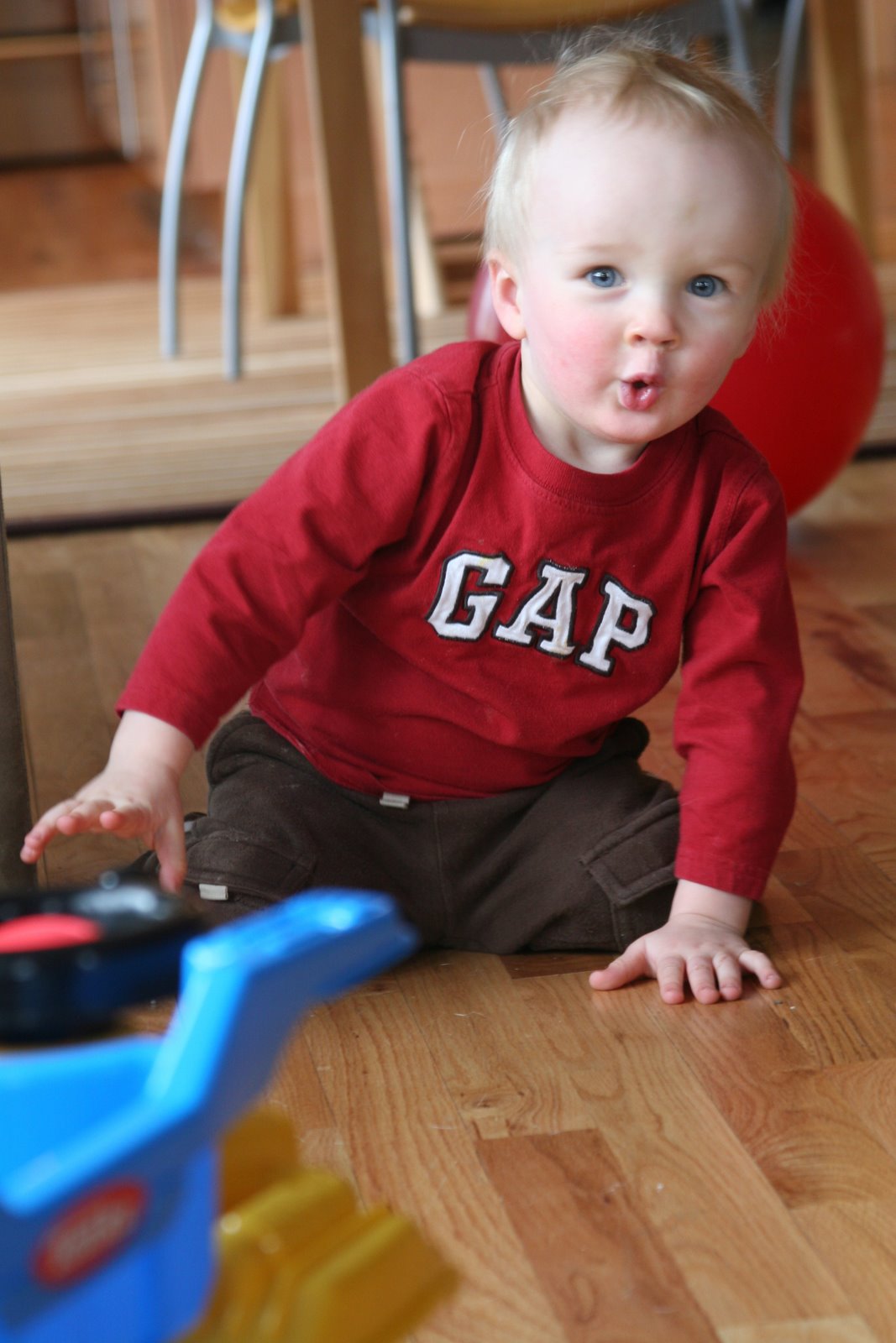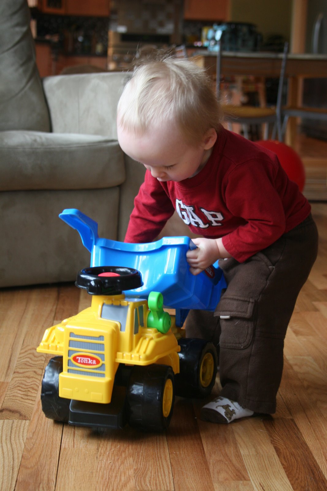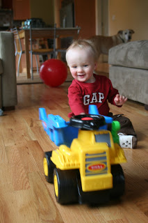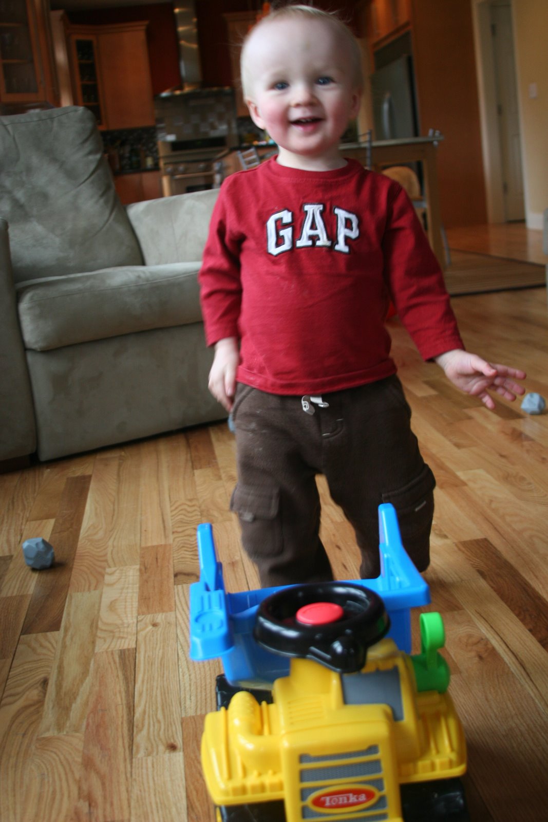 I thought it was about time Quinn got his first Tonka truck — doesn\’t every little boy need a Tonka truck? Here he is having some fun with it. The wheels make a rumbling sound when it moves so Quinn loves pushing it around. And you can see that Darwin retreated as soon as he saw the camera — he\’s so camera shy.