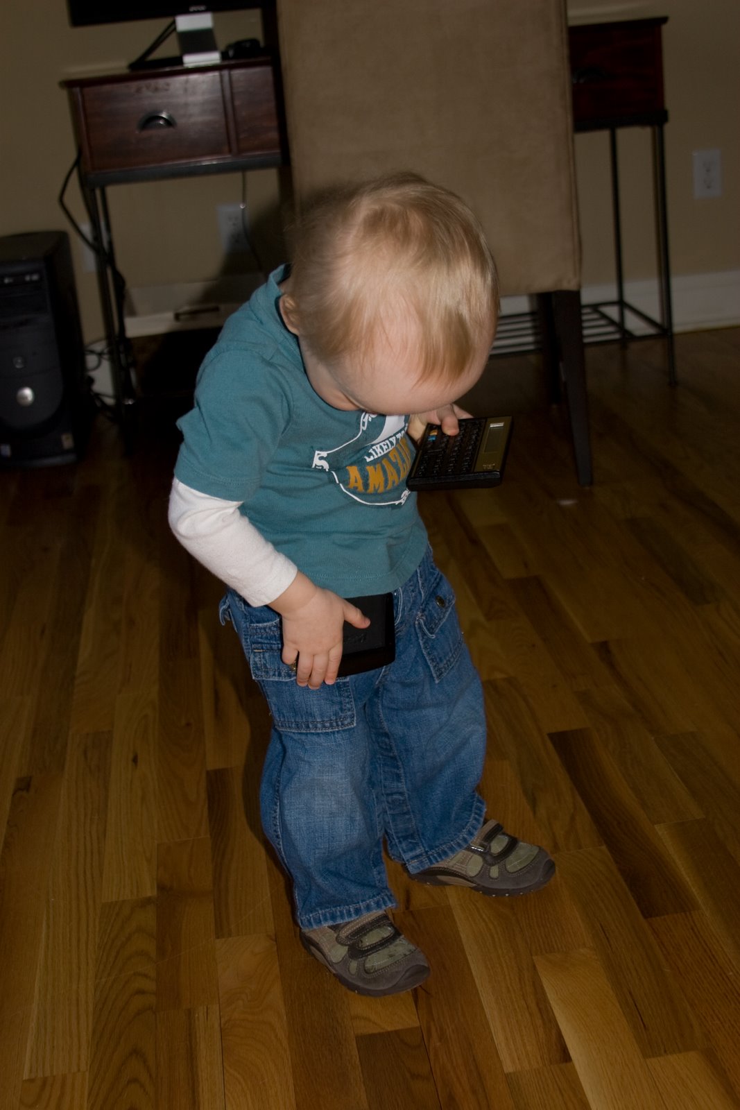 And a smart techie dude wouldn\’t go anywhere without his HP 12C calculator. Here he is figuring out our new mortgage payment while checking messages on his blackberry. A chip off the ol\’ block π