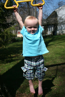 And our little monkey likes to hang! Here he is hanging out on our swingset in the back yard.