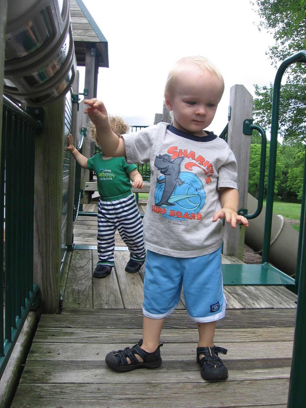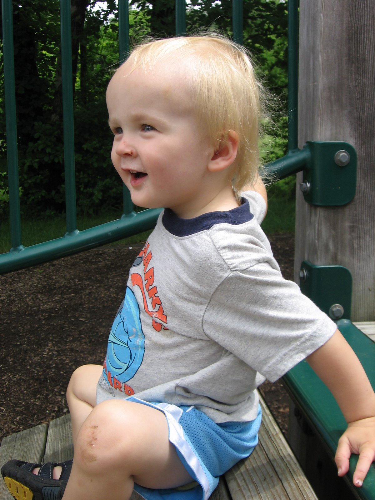Here\’s our boy. Can you see the cut on his nose, the scrape on his knees, and the bruise on his forehead. He has a new adventurous streak and likes to test his limits. He is all boy!!