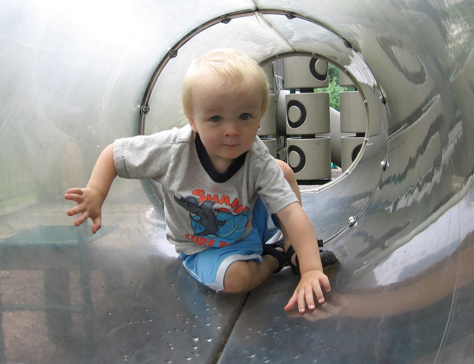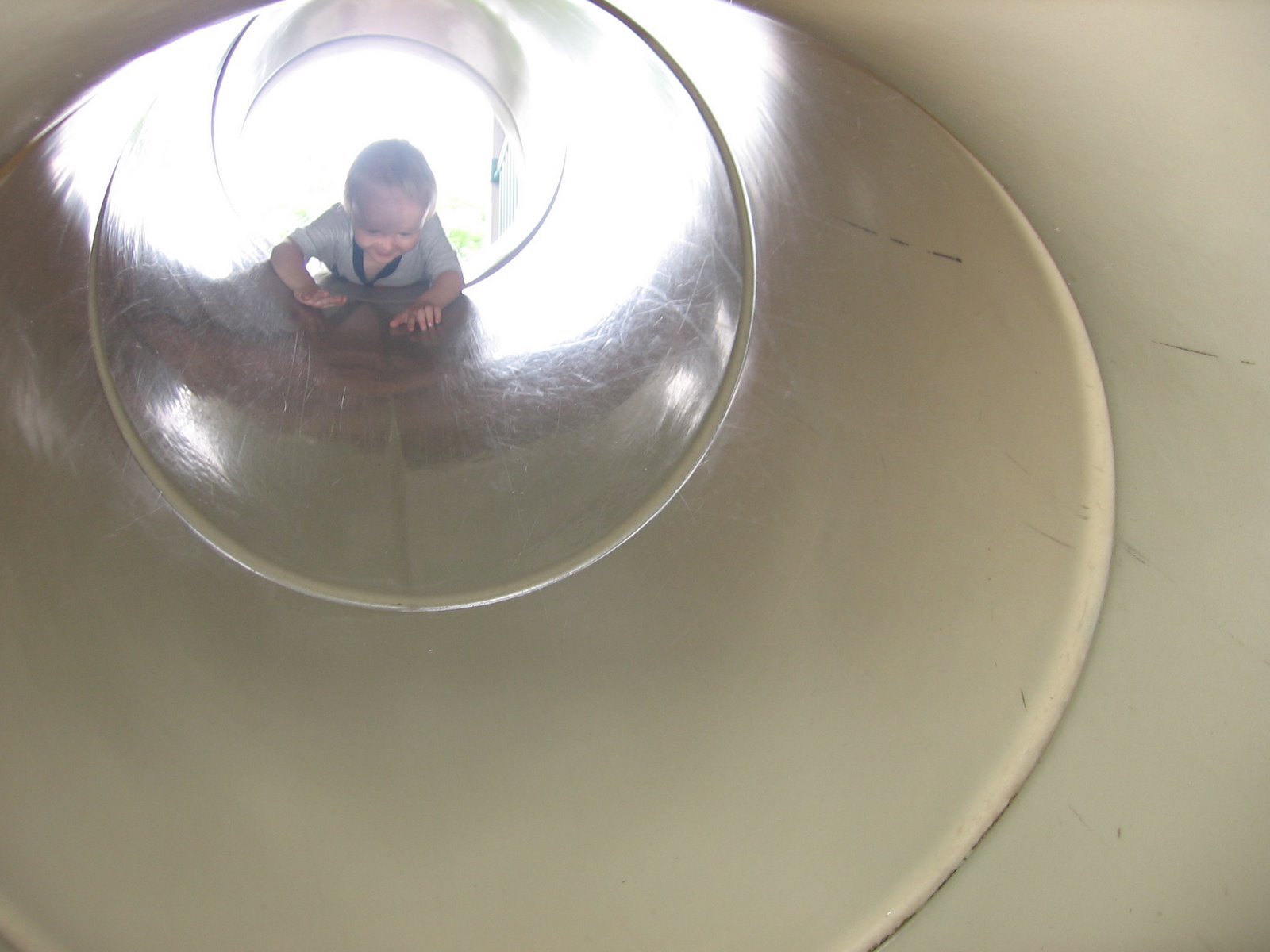 Going down the slide head first.