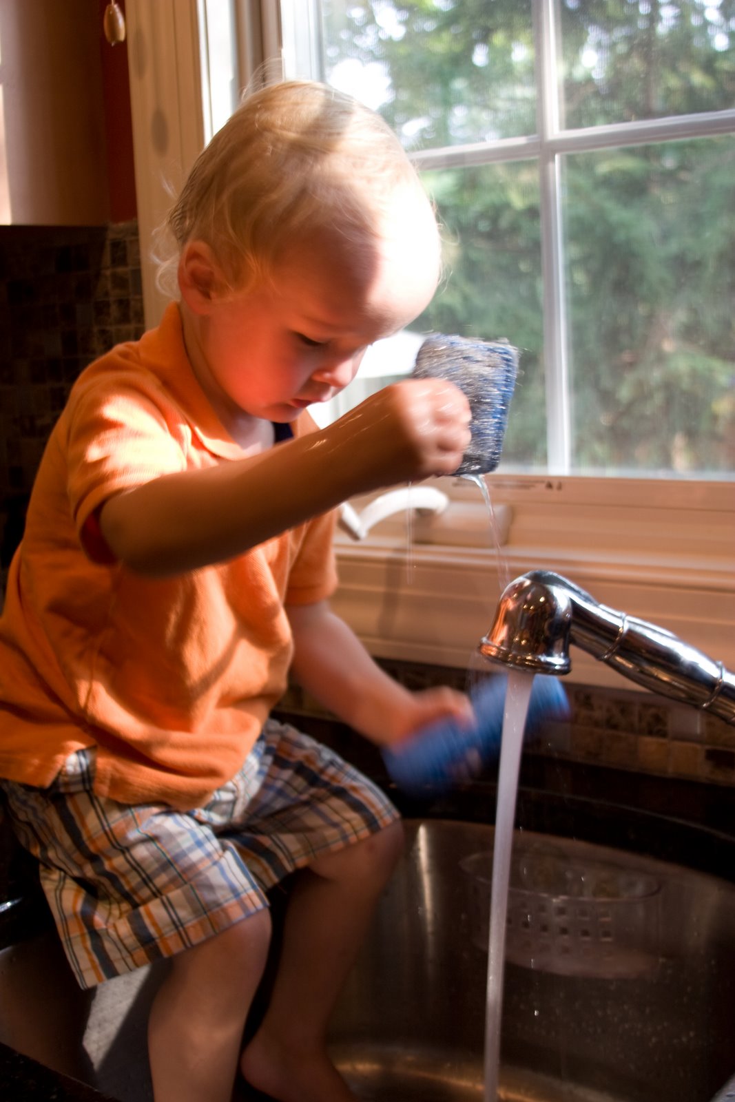 I think I blogged in a previous post about Quinn\’s new obsession with my iphone. I have it loaded with some pbs kids tv shows and kids games. Today he was jumping on the couch and bumped his head. He started crying and asked to nurse. We started nursing and he stopped and started crying for his \”video\”. OK, now that\’s bad. So, I gave him his video for a little bit and then took it away. That brought on quite a crying fit. In order to cheer him, I set him in the kitchen sink. Nothing like playing with water to get your mind off of video.