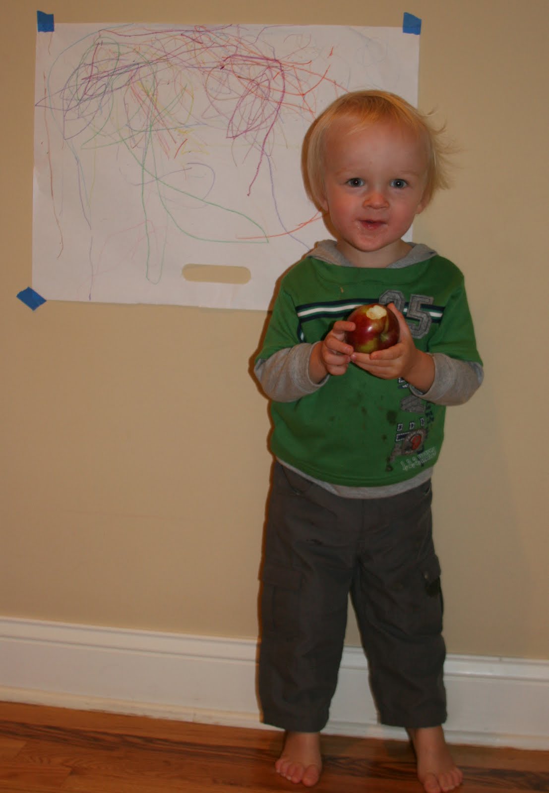 And the collection of Quinn art begins! Here he is standing in front of his masterpiece (which is still taped to the wall). On a side note, Quinn loves his apples. I found some smaller sized local apples at Whole Foods that Quinn has been digging in to.