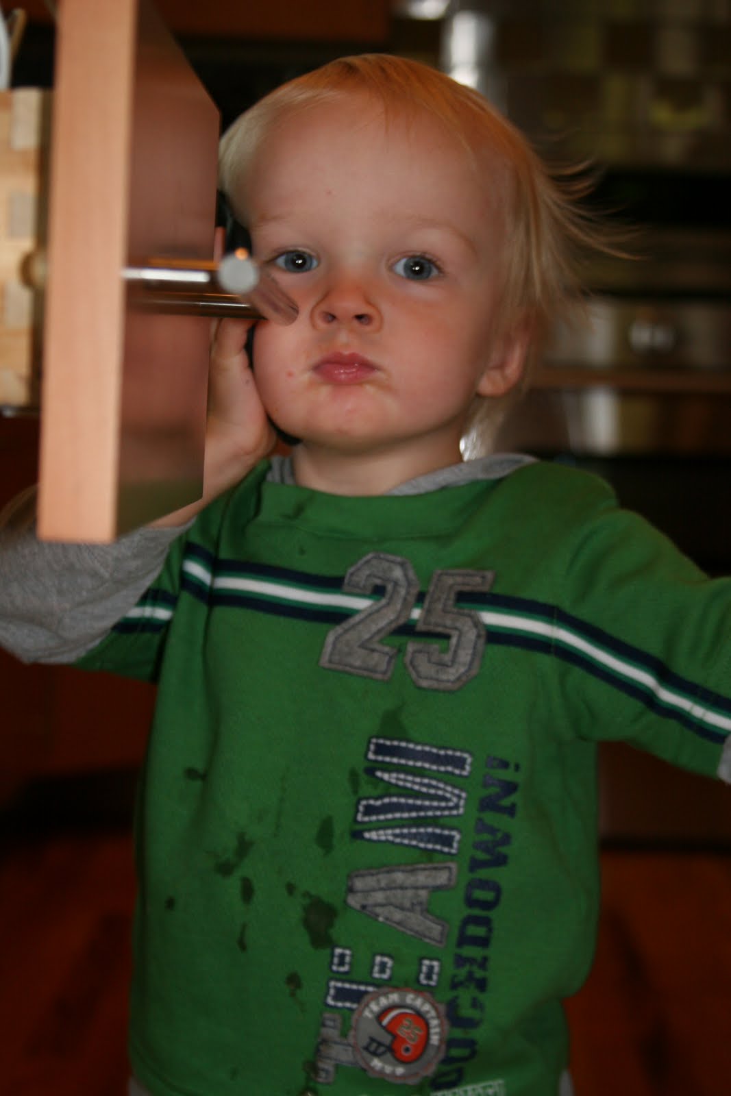 Then we moved on to digging through the kitchen drawers. It\’s amazing the stuff he pulls out of the drawers. He\’s frequently looking for an iphone (or video as he calls it).