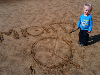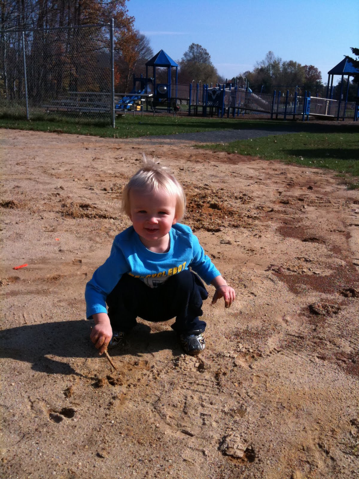 And this is what typically happens when we go to the playground (see it way back there in the background). Quinn plays on the equipment for about 5 minutes and then off he goes — in to the woods, out in the field, playing in the sand. Definitely more fun that the playground!