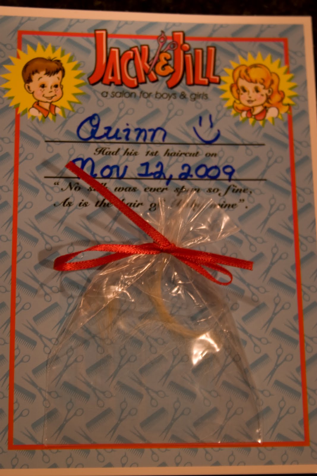 Quinn got this certificate for his first haircut. He also had his first lollipop, which he enjoyed very much!