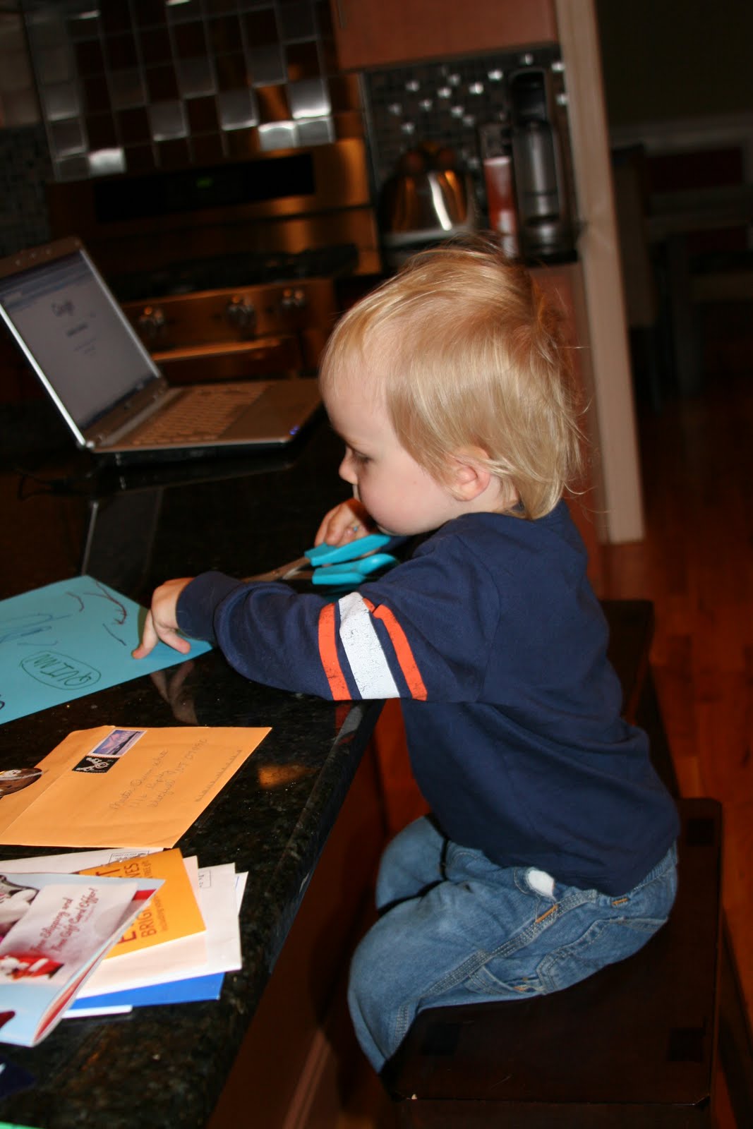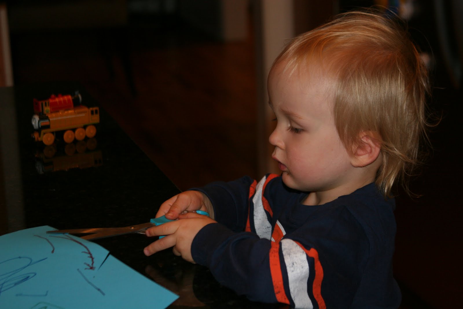 Here\’s our boy sitting at the counter cutting up some paper.
