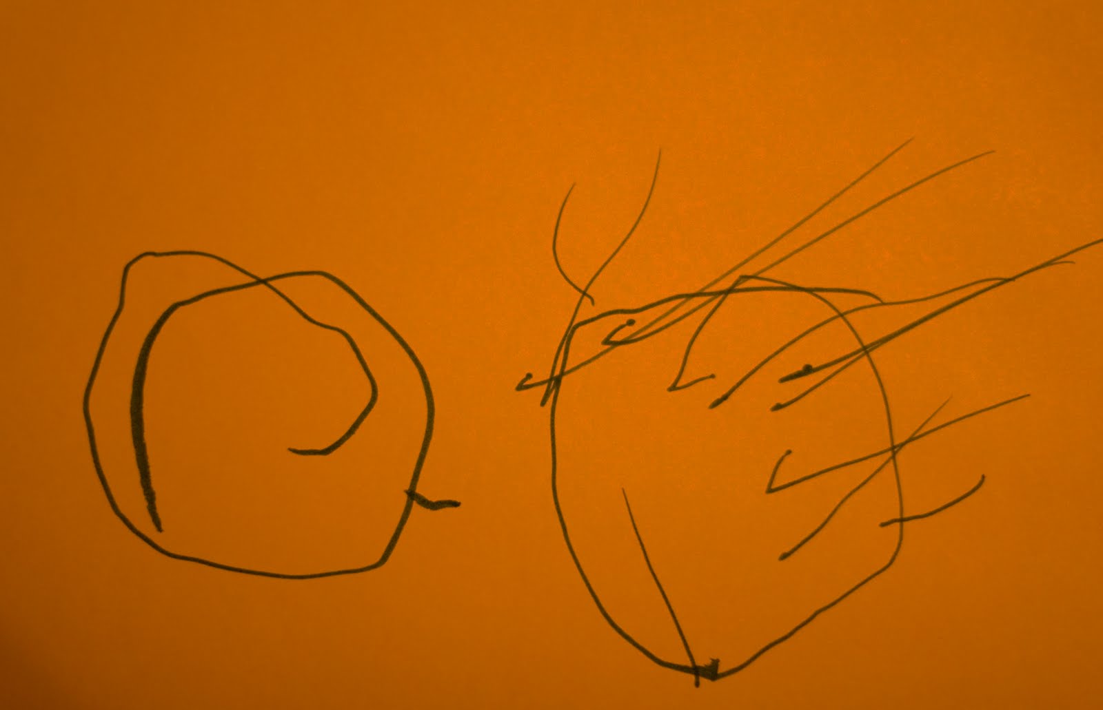 And yes, you could call us braggarts. Tonight Quinn was \”write paper\” as he calls writing with markers on paper. Don told him to draw a Q. And he did!! He drew a circle and added the little line for the Q, as you can see on the left. And then he took it upon himself to draw the sun (on the right). \”Sun!\”, he said.