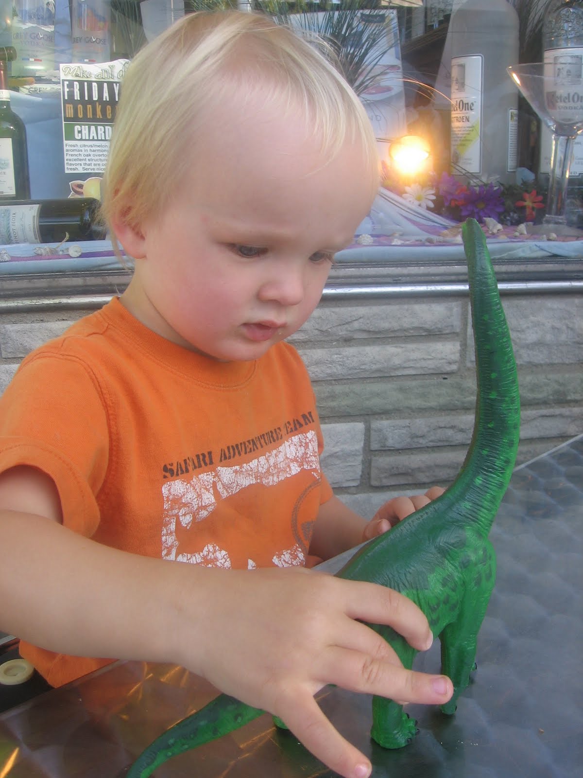 I downloaded a bunch of images from my small camera that I don\’t use that often and found some older pics. Here are some from an al fresco dinner in September. I believe we had gone to the toy store to get some Thomas parts for Q\’s birthday present and also picked up this dinosaur who apparently was thirsty.