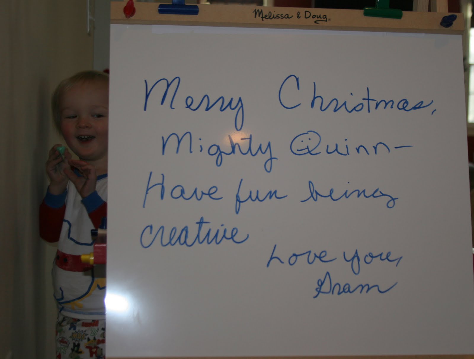 Grams arrived on Monday for Christmas after a 2 hour delay at Amtrak. We are so happy to have her here for Christmas. Every morning Quinn wakes up and says \’go see Grams\’. They have such a great time together! Since she is leaving the day after Christmas, we decided to start giving Quinn some of his presents early so that she can have time to enjoy the presents with him.