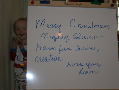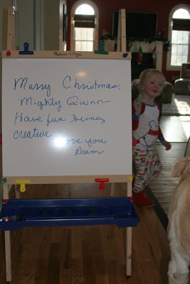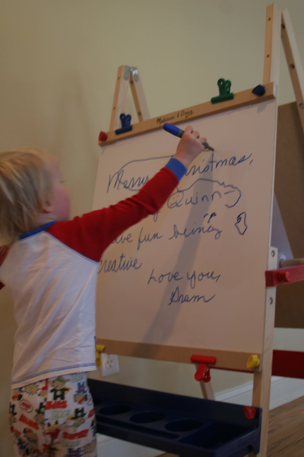 Yesterday he got an easel from Grams and has had a great time drawing all over it. It\’s very cool because it has a white board on one side, a chalk board on the other, and then a roll of paper in the middle that you pull over the white board for painting. Quinn loves to draw and write so I know he will have alot of fun with this.