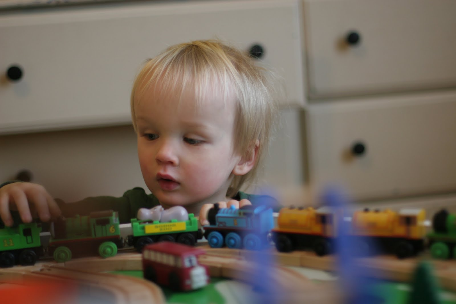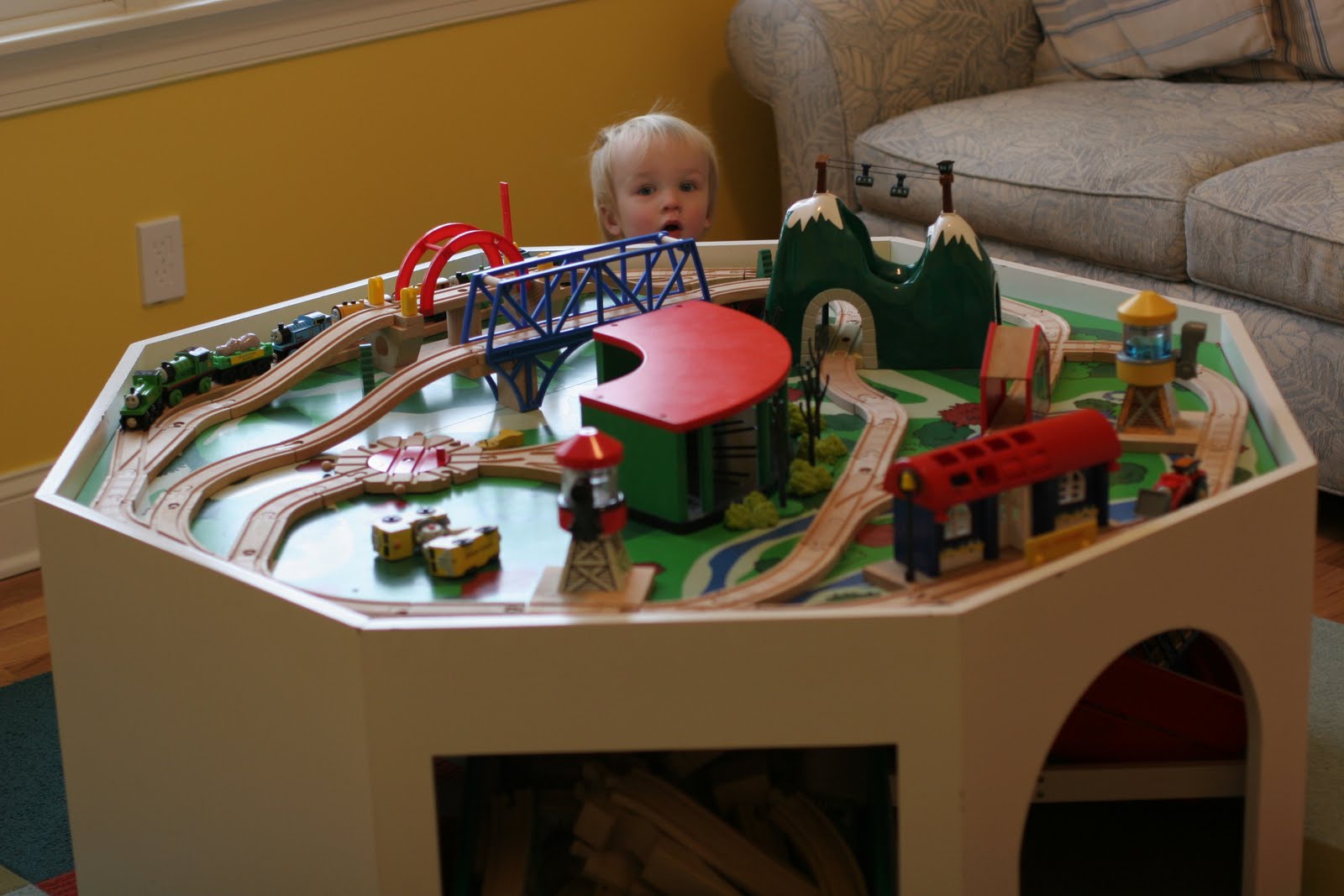 Mr. Engineer, Don, loves this table because all the curves are very gentle and the trains won\’t fall over when going around a curve. He put alot of thought in to the design and it is really great. He also revamped the table downstairs with some spare parts from this table so that Quinn actually has 2 new train configurations. It\’s funny because I found Don sitting in the living room staring at the table on Christmas day and I asked him if everything was OK. Yes, he was just studying to the configuration to see how he could improve it. I\’m sure both table will be tweaked and improved over the next 3 or more years.