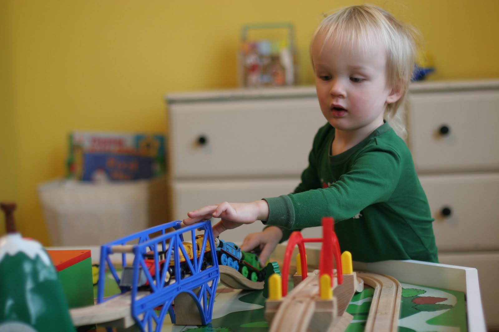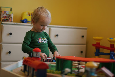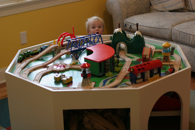 You might remember that Quinn got a train table for his birthday in October. He loves it and plays with each and every day. This table is the \”coffee table\” in our living room. We keep the spare tracks, trains, etc in a drawer in Quinn\’s playroom upstairs. We found that whenever he was in his playroom, he would just pull out the tracks and trains and play with them upstairs. He plays with his other toys in his playroom too, but he really loves his trains. So, we decided to get a train table for his playroom for Christmas. We found a great set on craigslist with the table, miles of tracks, buildings, and lots of trains and car.