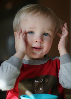 Quinn was having some Mangoes and Sticky Rice after lunch the other day and the light was just right. He was also very happy and being silly so I grabbed the camera. Here\’s a good look at his little boy haircut. As you can see, he still has a \”tail\” peeking around in the back.