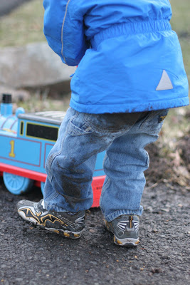 We started off down the driveway with Thomas and made an abrupt stop at a puddle at the bottom of the driveway. What\’s a boy to do? Get wet and dirty!
