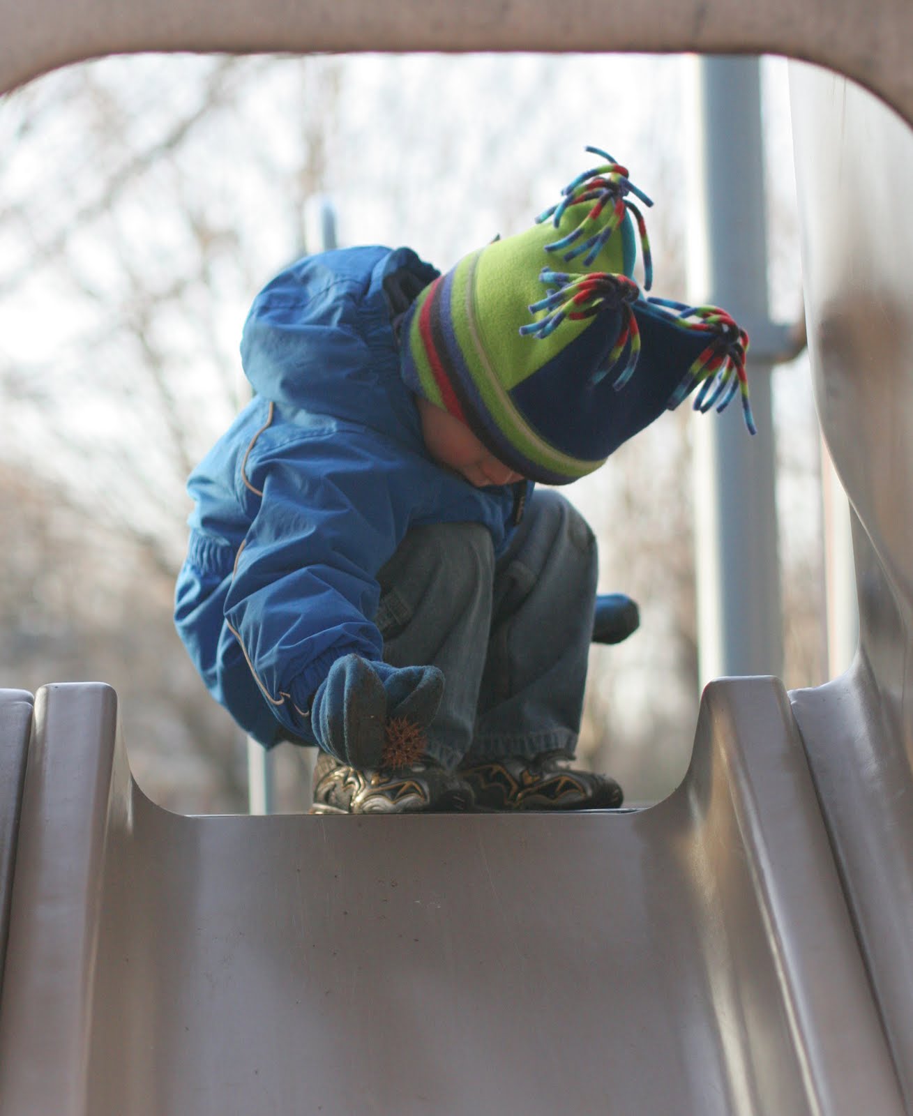 About an hour after walking out the front door we made it to the park. Quinn the Scientist needs to understand how this gumball is going to roll down the slide.