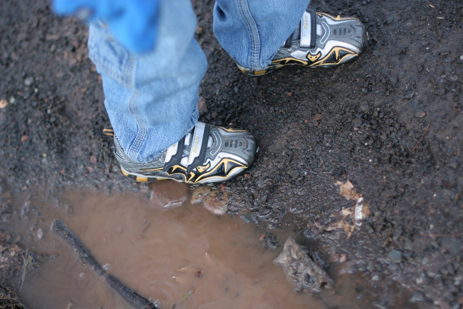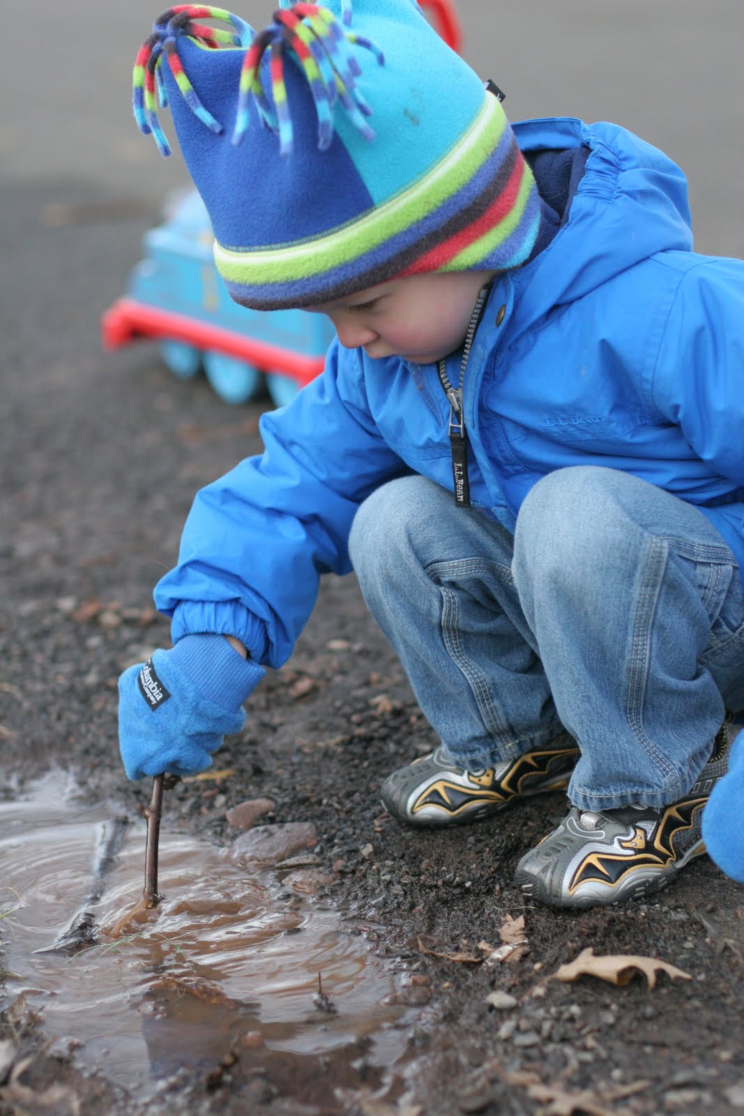 We started off down the driveway with Thomas and made an abrupt stop at a puddle at the bottom of the driveway. What\’s a boy to do? Get wet and dirty!