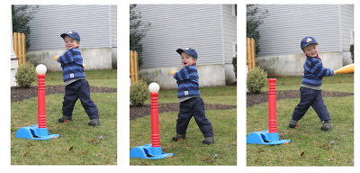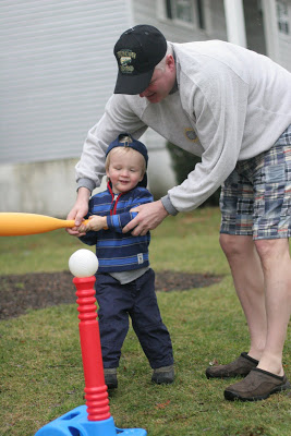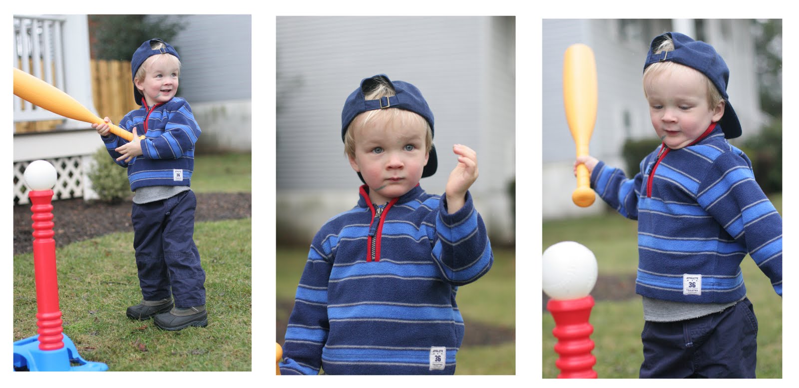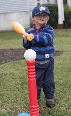 Quinn got a tball set and Don has been eager to get him outside to hit some balls. What better day than a gloomy, rainy Sunday. Quinn got on his snow boots and rain pants and was ready to go. Do not adjust your monitor, Quinn just finished drawing with magic markers (all over his face).