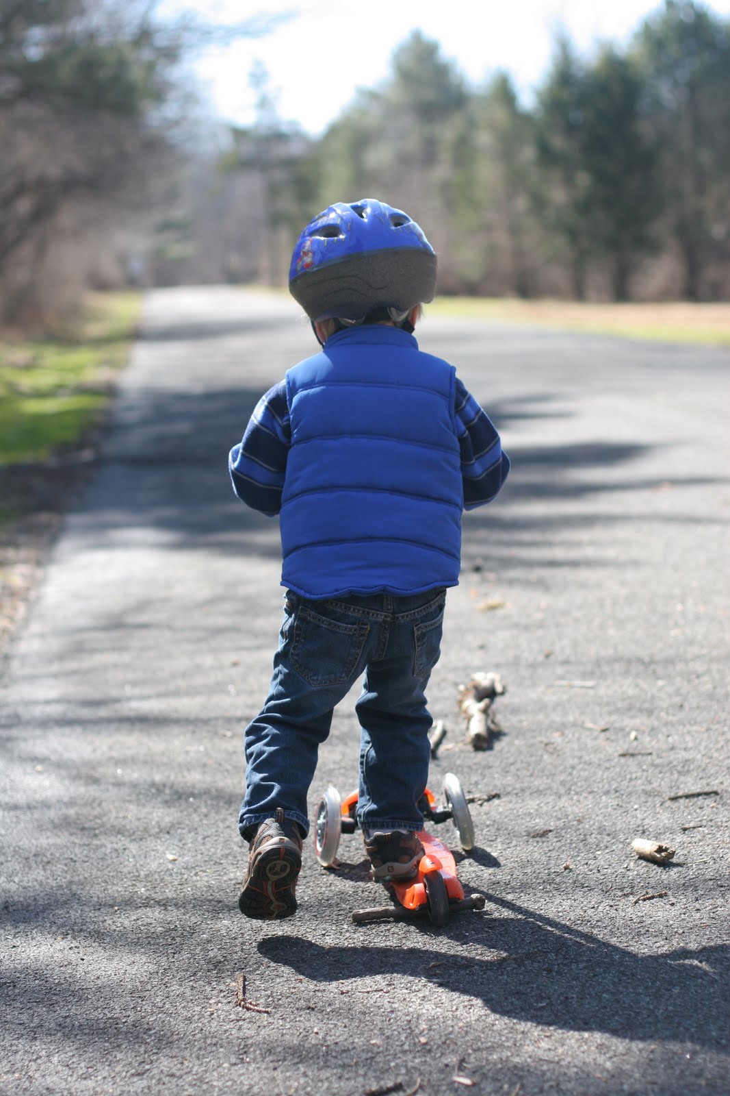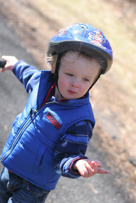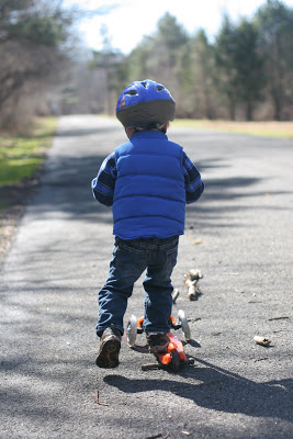 Quinn got a scooter for his birthday — you may remember this post of him riding it around the house. Well for the first time we got the scooter outside. The weather has been *beautiful* in NJ so Quinn and I headed to one of our favorite parks, Trailside. I also recently got a helmet for Quinn and the rule is that he can\’t get on his scooter or tricycle without a helmet. Not so happy about that at first but today he played for a long time before he realized that it was still on. Safety first! 🙂