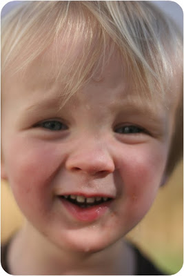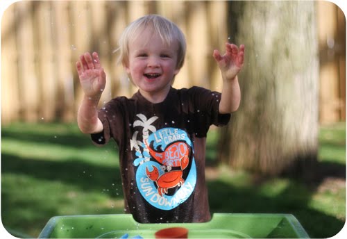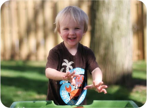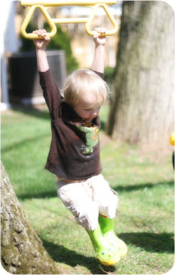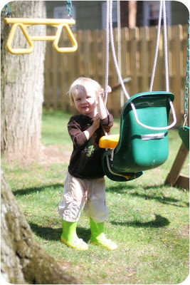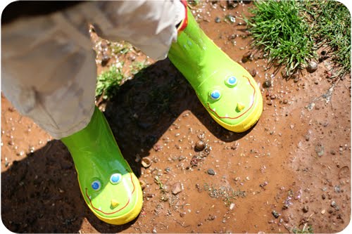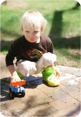 One of Quinn\’s favorite DVD\’s is Thomas\’ \”Splish, Splash, Splosh!\”. Thomas and his pal Rosie run through mud puddles splashing each other and other engines. They are very cheeky that way! Quinn has discovered that it is quite fun to splash with his feet, scooter, Thomas, whatever. I thought it was high time to get him some rain boots so that he could do some proper splish, splash, sploshing. Of course we\’ve had nothing but sunny skies since the boots arrived, but that didn\’t keep them off Quinn\’s feet.